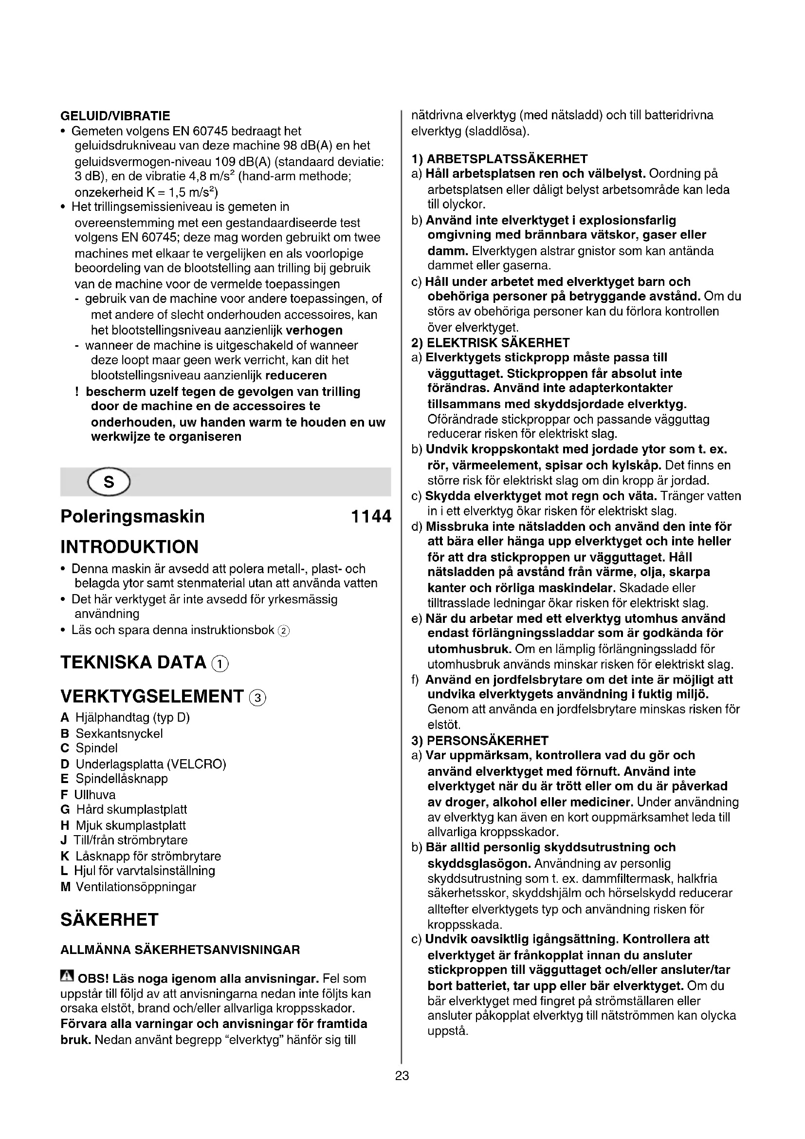 a) Elverktyget ar avsett att fungera som poleringsmaskin. Beakta alla sakerhetsanvisningar, anvisningar, illustrationer och data som levereras med elverktyget. Om nedanstående anvisningar ignoreras finns risk for att elstöt, brand och/eller allvariga personskador uppstár.
