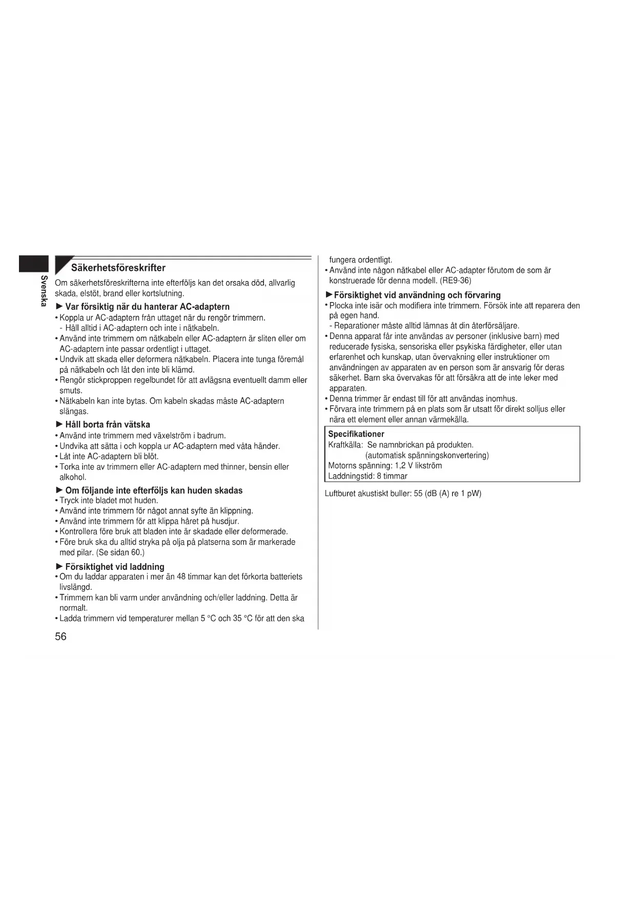 fungera ordentligt. Använd inte någon nätkabel eller AC‑adapter förutom de som är konstruerade för denna modell. (RE9‑36) Försiktighet vid användning och förvaring Plocka inte isär och modiera inte trimmern. Försök inte att reparera den på egen hand. Reparationer måste alltid lämnas åt din återförsäljare. Denna apparat får inte användas av personer (inklusive barn) med reducerade fysiska, sensoriska eller psykiska färdigheter, eller utan erfarenhet och kunskap, utan övervakning eller instruktioner om användningen av apparaten av en person som är ansvarig för deras säkerhet. Barn ska övervakas för att försäkra att de inte leker med apparaten. Denna trimmer är endast till för att användas inomhus. Förvara inte trimmern på en plats som är utsatt för direkt solljus eller nära ett element eller annan värmekälla. Specikationer Kraftkälla: Se namnbrickan på produkten. (automatisk spänningskonvertering) Motorns spänning: 1,2 V likström Laddningstid: 8 timmar Luftburet akustiskt buller: 55 (dB (A) re 1 pW)