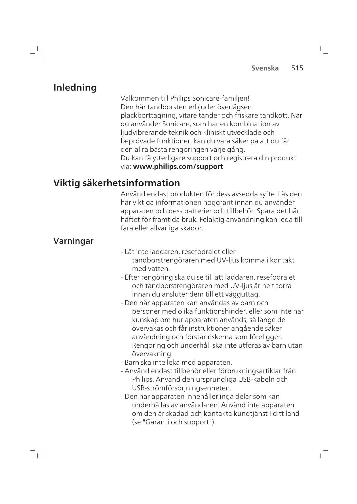 Svenska Inledning Välkommen till Philips Sonicare-familjen! Den här tandborsten erbjuder överlägsen plackborttagning, vitare tänder och friskare tandkött. När du använder Sonicare, som har en kombination av ljudvibrerande teknik och kliniskt utvecklade och beprövade funktioner, kan du vara säker på att du får den allra bästa rengöringen varje gång. Du kan få ytterligare support och registrera din produkt via: www.philips.com/support Viktig säkerhetsinformation Använd endast produkten för dess avsedda syfte. Läs den här viktiga informationen noggrant innan du använder apparaten och dess batterier och tillbehör. Spara det här häftet för framtida bruk. Felaktig användning kan leda till fara eller allvarliga skador. Varningar - Låt inte laddaren, resefodralet eller tandborstrengöraren med UV-ljus komma i kontakt med vatten. - Efter rengöring ska du se till att laddaren, resefodralet och tandborstrengöraren med UV-ljus är helt torra innan du ansluter dem till ett vägguttag. - Den här apparaten kan användas av barn och personer med olika funktionshinder, eller som inte har kunskap om hur apparaten används, så länge de övervakas och får instruktioner angående säker användning och förstår riskerna som föreligger. Rengöring och underhåll ska inte utföras av barn utan övervakning. - Barn ska inte leka med apparaten. - Använd endast tillbehör eller förbrukningsartiklar från Philips. Använd den ursprungliga USB-kabeln och USB-strömförsörjningsenheten. - Den här apparaten innehåller inga delar som kan underhållas av användaren. Använd inte apparaten om den är skadad och kontakta kundtjänst i ditt land (se "Garanti och support").516 Svenska - Använd inte USB-kabeln eller USB- strömförsörjningsenheten om den är skadad. - Använd inte laddaren, resefodralet och/eller tandborstrengöraren med UV-ljus utomhus eller i närheten av uppvärmda ytor. - Rengör inga delar i diskmaskin. - Apparaten har utformats endast för rengöring av tänder, tandkött och tunga. - Förvara alltid tandborstrengöraren med UV-ljus utom räckhåll för barn. - Använd inte tandborstrengöraren med UV-ljus om UV-lysdioden/-lampan fortfarande lyser när tandborstrengöraren är öppen. UV-ljus kan vara skadligt för ögon och hud. - Använd endast tandborstrengöraren med skyddsskärmen på plats. - Rör inte tandborstrengörare med UV-ljus UV-lampa när den är varm. - Sluta använda ett borsthuvud om det har skadade eller böjda strån. Byt ut borsthuvudet var tredje månad eller oftare vid märkbart slitage. - Undvik direkt kontakt med produkter som innehåller eteriska oljor eller kokosolja. Kontakten kan leda till att borsten lossnar. - Maximal höjd över havet vid användning är 4500meter. MEDICINSKA VARNINGAR - Sluta använda apparaten och rådfråga en tandläkare/läkare om kraftig blödning uppstår efter användning, om det fortsätter att blöda efter en veckas användning eller om du upplever obehag eller smärta. - Om du har genomgått operation i munnen eller tandköttet de senaste två månaderna ska du rådgöra med din tandläkare innan du använder apparaten. - Om du har en pacemaker eller någon annan implanterad enhet bör du rådgöra med din läkare eller tillverkaren av den implanterade enheten före användning. - Om du har hälsoproblem bör du rådfråga läkare innan du använder apparaten.517 Svenska - Apparaten är avsedd för egenvård och inte för att användas på flera patienter på en tandläkarmottagning eller -klinik. Säkerhetsföreskrifter för batteri - Denna apparat innehåller batterier som endast får tas bort av fackmän. - Använd endast produkten för dess avsedda syfte. Läs den här informationen noggrant innan du använder produkten och dess batterier och tillbehör, och spara den för framtida bruk. Felaktig användning kan leda till fara eller allvarliga skador. Olika tillbehör kan medfölja olika modeller. - Använd endast tillbehör och förbrukningsartiklar från Philips. Använd endast den löstagbara strömförsörjningsenheten TCBxxxx (ingångsvärden: 100–240V~, 50/60Hz, 1,5W), HX6100 (ingångsvärden: 100–240V~, 50/60Hz, 1,4W), HX6110 (ingångsvärden: 100–240V~, 50/60Hz, 1,5W), HX6160 (ingångsvärden: 100–240V~, 50/60Hz, 6W), WAAxxxx (ingångsvärden: 100–240 V~; 50/60 Hz; 3,5 W). - Utsätt inte produkten eller batterierna för eld och utsätt dem heller inte för direkt solljus eller för höga temperaturer. - Sluta använda och ladda produkten om den blir onormalt varm, luktar, ändrar färg eller om det tar längre tid än vanligt att ladda den. Kontakta även din lokala Philips-återförsäljare. - Placera inte produkten eller batterierna i mikrovågsugnar eller på induktionsplattor. - För att förhindra att batterierna värms upp eller avger giftiga eller farliga ämnen ska du inte öppna, ändra, sticka hål på, skada eller ta isär produkten eller batterierna. Kortslut inte och överladda inte batterierna och ladda inte batterierna med omvänd polaritet. - Den här apparaten har batterier som inte är utbytbara. När batteriet är slut ska apparaten kasseras på rätt sätt, se avsnittet om Återvinning.518 Svenska - Undvik kontakt med huden eller ögonen om batterierna är skadade eller läcker. Skölj omedelbart med rikligt med vatten och kontakta läkare in detta händer. - Se till att händerna, produkten och batterier är torra när du hanterar batterierna. - Ladda och använd produkten vid en temperatur mellan 0 °C och 40 °C. - Låt inte batteriernas poler komma i kontakt med metallföremål (t.ex. mynt, hårspännen eller ringar) efter borttagning för att undvika kortslutning. Slå inte in batterier i aluminiumfolie. Tejpa batteripolerna eller lägg batterierna i en plastpåse innan du kasserar dem. - Apparaten har en uppladdningsbar litiumjoncell. MÅSTE ÅTERVINNAS ELLER KASSERAS PÅ RÄTT SÄTT. Förvarings- och transportförhållanden Temperatur -10 °C till 60 