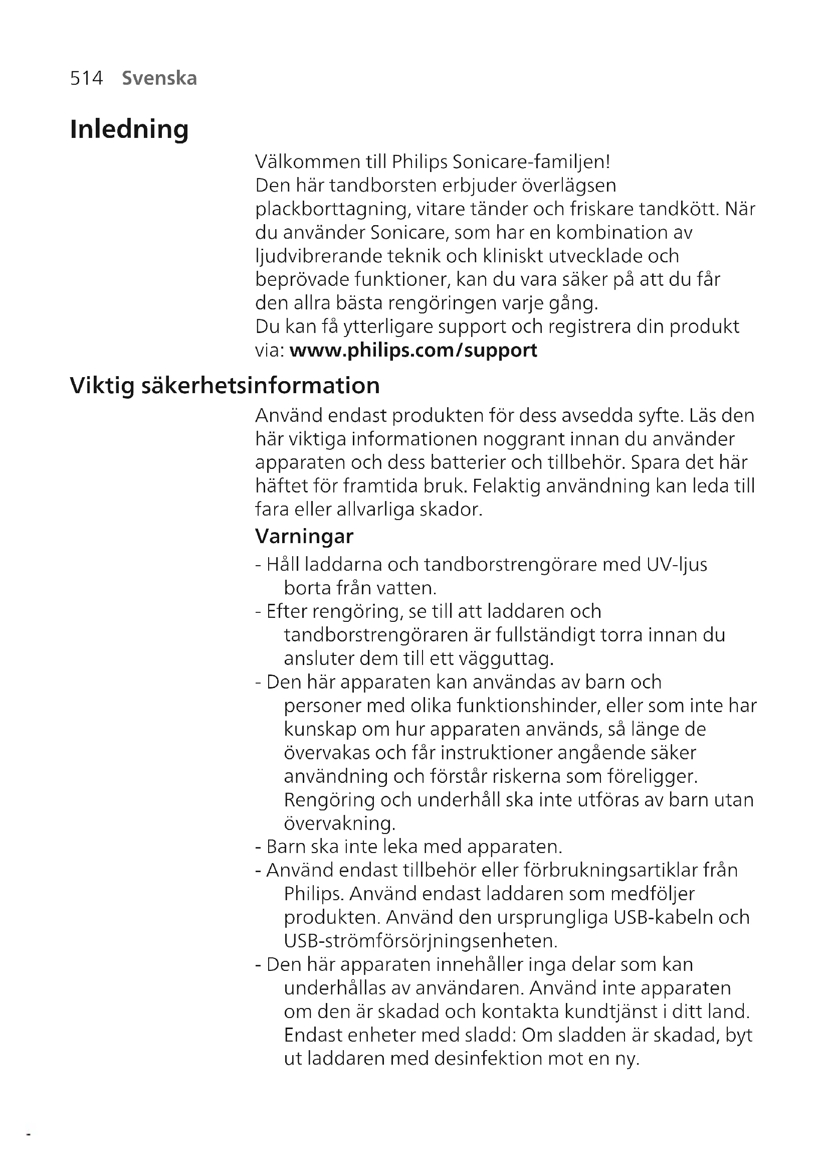 Svenska Inledning Välkommen till Philips Sonicare-familjen! Den här tandborsten erbjuder överlägsen plackborttagning, vitare tänder och friskare tandkött. När du använder Sonicare, som har en kombination av ljudvibrerande teknik och kliniskt utvecklade och beprövade funktioner, kan du vara säker på att du får den allra bästa rengöringen varje gång. Du kan få ytterligare support och registrera din produkt via: www.philips.com/support Viktig säkerhetsinformation Använd endast produkten för dess avsedda syfte. Läs den här viktiga informationen noggrant innan du använder apparaten och dess batterier och tillbehör. Spara det här häftet för framtida bruk. Felaktig användning kan leda till fara eller allvarliga skador. Varningar - Håll laddarna och tandborstrengörare med UV-ljus borta från vatten. - Efter rengöring, se till att laddaren och tandborstrengöraren är fullständigt torra innan du ansluter dem till ett vägguttag. - Den här apparaten kan användas av barn och personer med olika funktionshinder, eller som inte har kunskap om hur apparaten används, så länge de övervakas och får instruktioner angående säker användning och förstår riskerna som föreligger. Rengöring och underhåll ska inte utföras av barn utan övervakning. - Barn ska inte leka med apparaten. - Använd endast tillbehör eller förbrukningsartiklar från Philips. Använd endast laddaren som medföljer produkten. Använd den ursprungliga USB-kabeln och USB-strömförsörjningsenheten. - Den här apparaten innehåller inga delar som kan underhållas av användaren. Använd inte apparaten om den är skadad och kontakta kundtjänst i ditt land. Endast enheter med sladd: Om sladden är skadad, byt ut laddaren med desinfektion mot en ny.515 Svenska - Använd inte laddaren eller tandborstrengöraren utomhus eller i närheten av uppvärmda ytor. - Rengör inga delar i diskmaskin. - Apparaten har utformats endast för rengöring av tänder, tandkött och tunga. - Förvara alltid tandborstrengöraren utom räckhåll för barn. - Använd inte tandborstrengöraren om UV-lampan fortfarande lyser när luckan är öppen. UV-ljus kan vara skadligt för ögon och hud. - Använd endast tandborstrengöraren med skyddsskärmen på plats. - Rör inte tandborstrengörare med UV-ljus UV-lampa när den är varm. - Sluta använda ett borsthuvud om det har skadade eller böjda strån. Byt ut borsthuvudet var tredje månad eller oftare vid märkbart slitage. - Undvik direkt kontakt med produkter som innehåller eteriska oljor eller kokosolja. Kontakten kan leda till att borsten lossnar. - Sluta använda apparaten och rådfråga en tandläkare/läkare om kraftig blödning uppstår efter användning, om det fortsätter att blöda efter en veckas användning eller om du upplever obehag eller smärta. - Om du har genomgått operation i munnen eller tandköttet de senaste två månaderna ska du rådgöra med din tandläkare innan du använder apparaten. - Om du har en pacemaker eller någon annan implanterad enhet bör du rådgöra med din läkare eller tillverkaren av den implanterade enheten före användning. - Om du har hälsoproblem bör du rådfråga läkare innan du använder apparaten. - Apparaten är avsedd för egenvård och inte för att användas på flera patienter på en tandläkarmottagning eller -klinik. Säkerhetsföreskrifter för batteri - Denna apparat innehåller batterier som endast får tas bort av fackmän516 Svenska - Använd endast produkten för dess avsedda syfte. Läs den här informationen noggrant innan du använder produkten och dess batterier och tillbehör, och spara den för framtida bruk. Felaktig användning kan leda till fara eller allvarliga skador. Olika tillbehör kan medfölja olika modeller. - Använd endast tillbehör och förbrukningsartiklar från Philips. Använd endast avtagbar försörjningsenhet TCBxxxx, HX6100, HX6110, HX6160 eller WAAxxxx. - Utsätt inte produkten eller batterierna för eld och utsätt dem heller inte för direkt solljus eller för höga temperaturer. - Sluta använda och ladda produkten om den blir onormalt varm, luktar, ändrar färg eller om det tar längre tid än vanligt att ladda den. Kontakta även din lokala Philips-återförsäljare. - Placera inte produkten eller batterierna i mikrovågsugnar eller på induktionsplattor. - För att förhindra att batterierna värms upp eller avger giftiga eller farliga ämnen ska du inte öppna, ändra, sticka hål på, skada eller ta isär produkten eller batterierna. Kortslut inte och överladda inte batterierna och ladda inte batterierna med omvänd polaritet. - Den här apparaten har batterier som inte är utbytbara. När batteriet är slut ska apparaten kasseras på rätt sätt, se avsnittet om Återvinning. - Undvik kontakt med huden eller ögonen om batterierna är skadade eller läcker. Skölj omedelbart med rikligt med vatten och kontakta läkare in detta händer. - Se till att händerna, produkten och batterier är torra när du hanterar batterierna. - Låt inte batteriernas poler komma i kontakt med metallföremål (t.ex. mynt, hårspännen eller ringar) efter borttagning för att undvika kortslutning. Slå inte in batterier i aluminiumfolie. Tejpa batteripolerna eller lägg batterierna i en plastpåse innan du kasserar dem. - Ladda, använd och förvara produkten vid en temperatur mellan 0°C och 40°C.517 Svenska Förvarings- och transportförhållanden Temperatur -10 °C till 60 °C. Elektromagnetiska fält (EMF) Den här Philips-apparaten uppfyller alla tillämpliga standarder och regler gällande exponering av elektromagnetiska fält. Direktiv för radioutrustning Härmed förklarar Philips att el-tandborstar med radioutrustningstyp (Bluetooth, NFC) är i överensstämmelse med direktiv 2014/53/EU. - Den Bluetooth-radiofrekvens som används i tillämpliga produkter ansluter till 2,4 GHz. - Den maximala uteffekten från Bluetooth-apparaten är 3 dBm. - Den NFC-radiofrekvens som anv