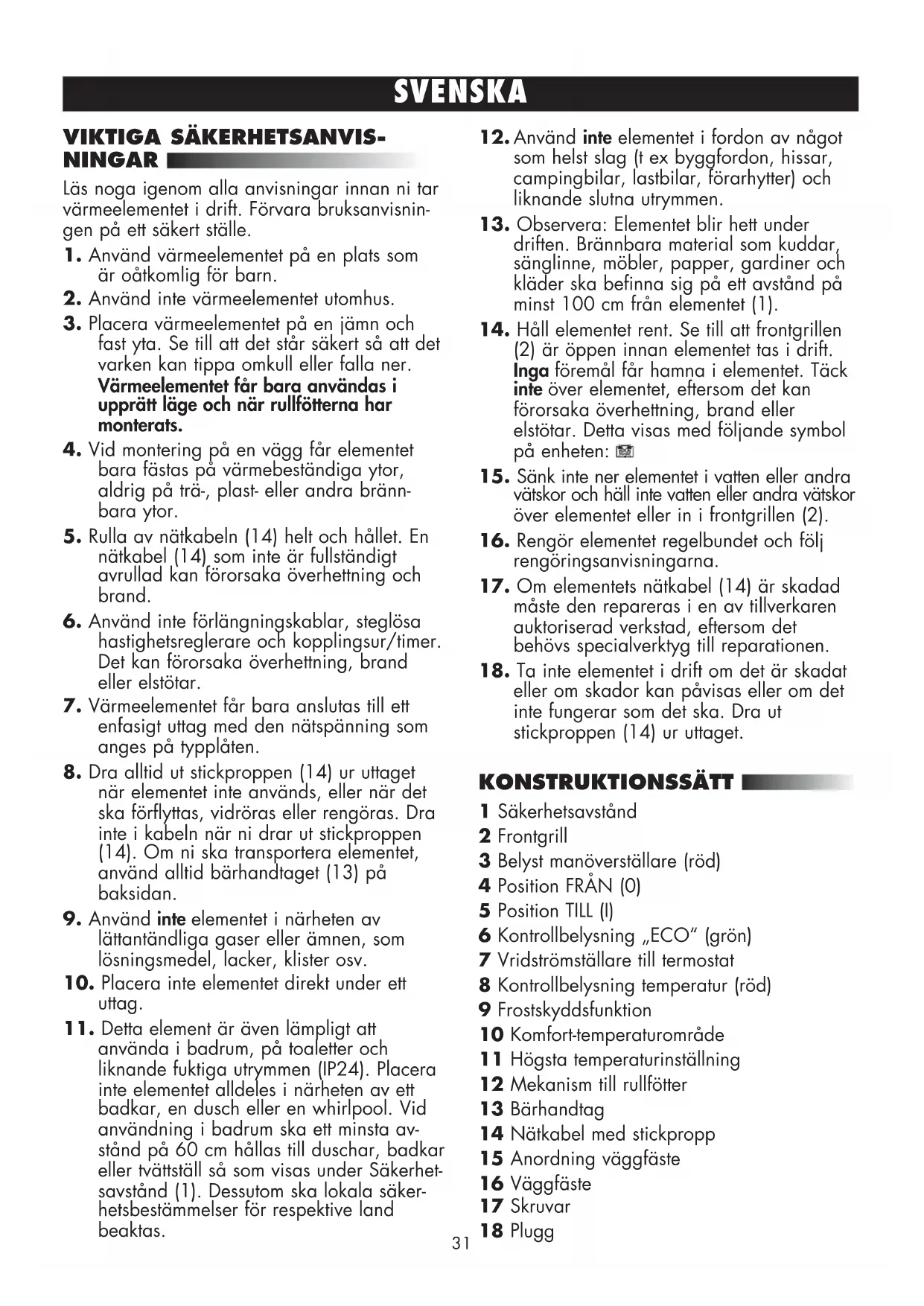 NINGAR Läs noga igenom alla anvisningar innan ni tar värmeelementet i drift. Förvara bruksanvisnin- gen på ett säkert ställe.