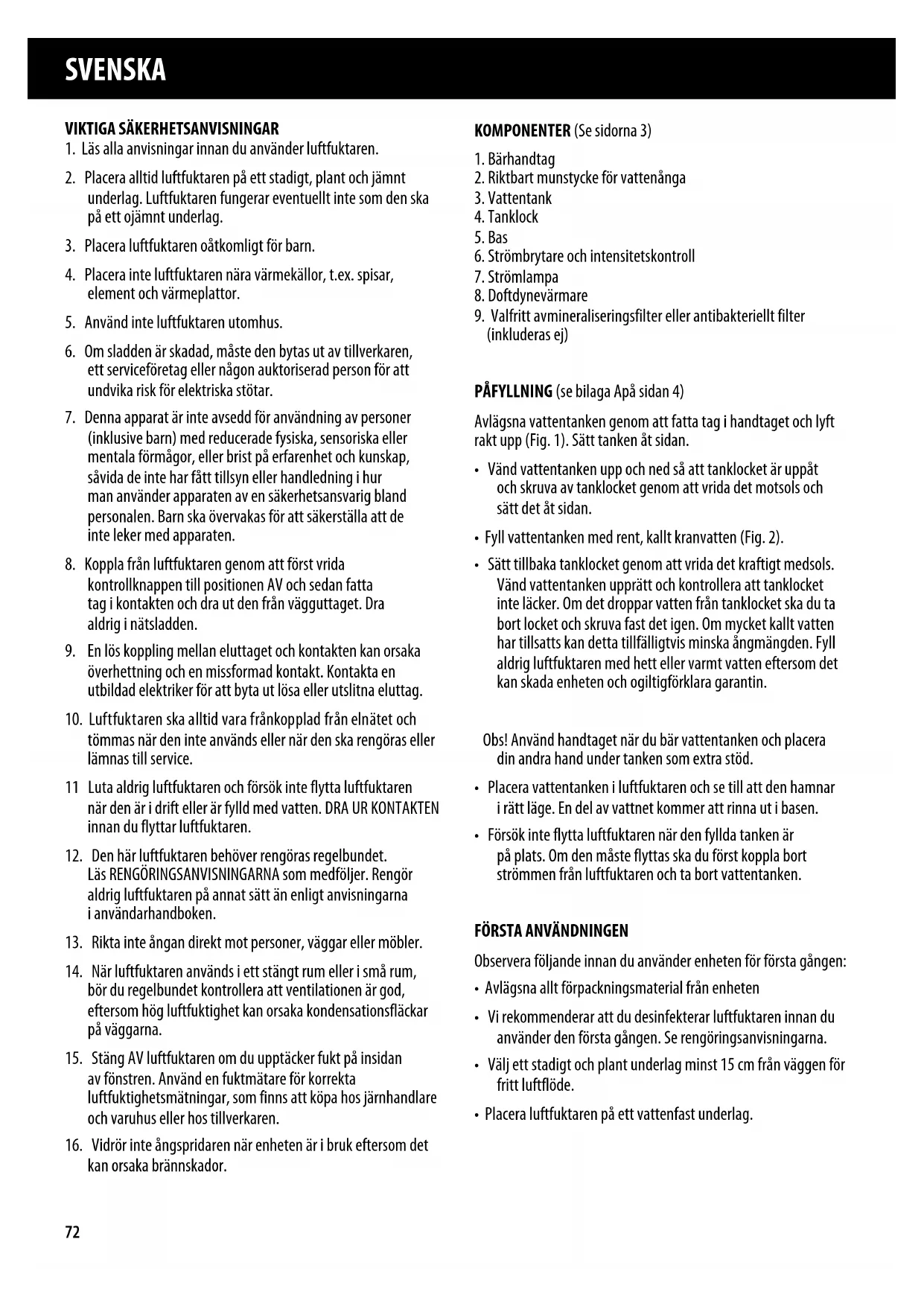 - Placera luftfuktaren på ett vattenfast underlag.73 SVENSKA DRIFTSANVISNINGAR