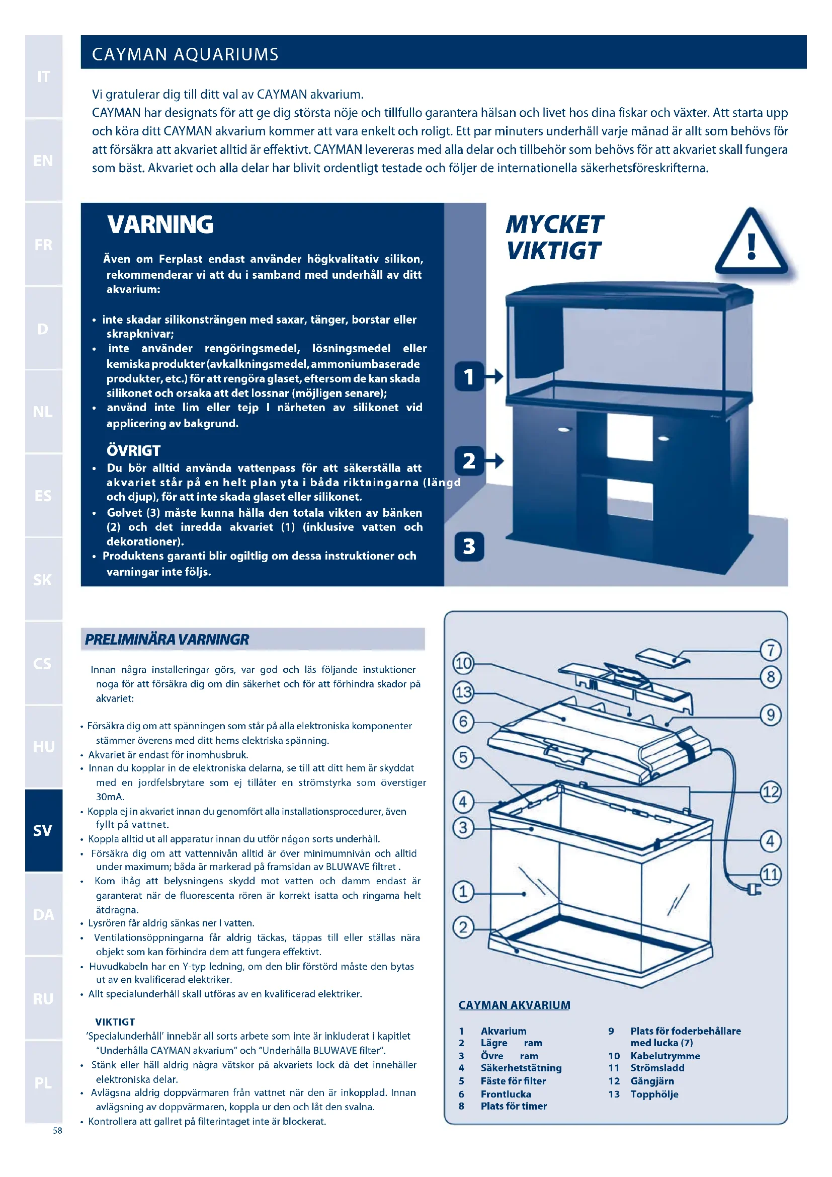 Innan nagra installeringar gors, var god och las foljande instuktioner noga for att forsakra dig om din sakerhet och for att forhindra skador pa akvariet: