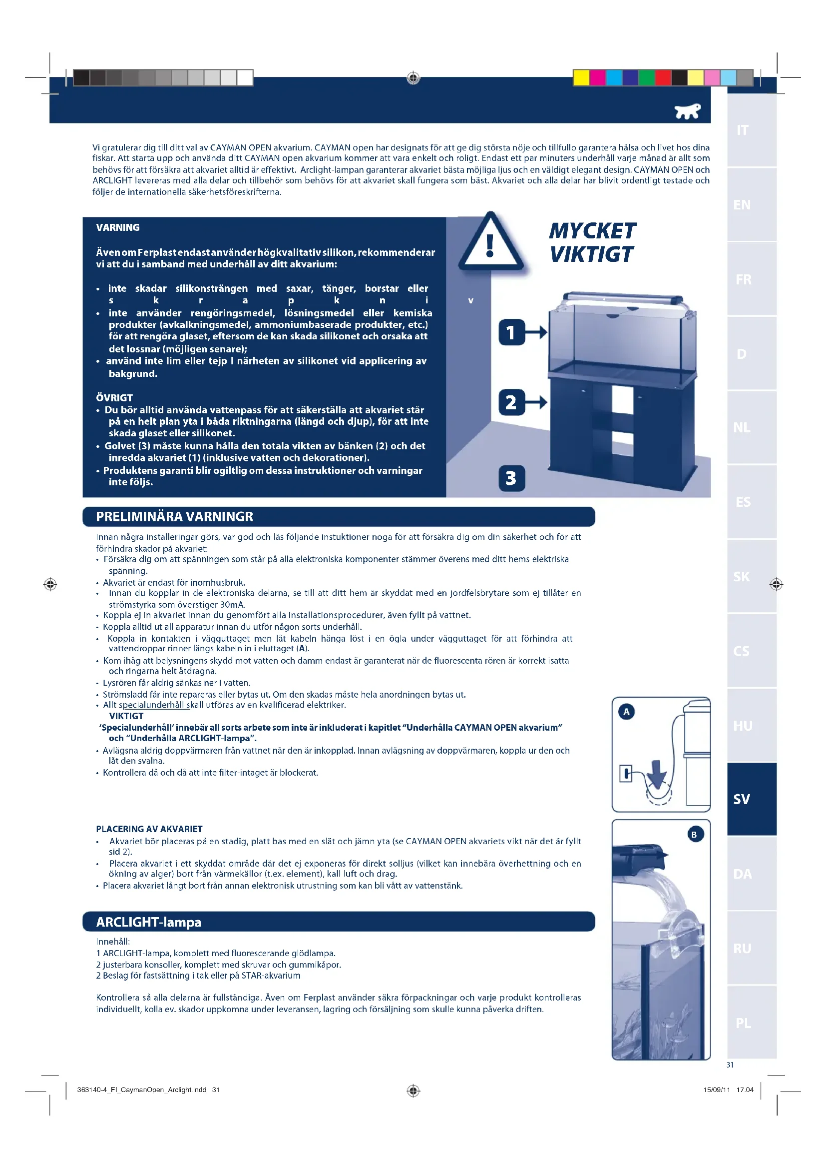Vi gratulerar dig till ditt val av CAYMAN OPEN akvarium. CAYMAN open har designats for att ge dig storsta noje och tillfulgo garantera hsa och livet hos din fiskar. Att starta opp och anvanda ditt CAYMAN open akvarium kommer att vara enkelt och roigt. Endast ett par minuters underhall varje manad ar allt som behovs for att forsakra att akvariet alltd ar effektiv. Arclight-lampan garanterar akvariet basta mojliga lus och en valdigt elegant design. CAYMAN OPEN och ARCLIGHT levereras med alla delar och tillbehor som behovs for att akvariet skall fungera som bast. Akvariet och alla delar har blivit ordentlig testade och foljer de internationla sakerhetsfreskrifterna.