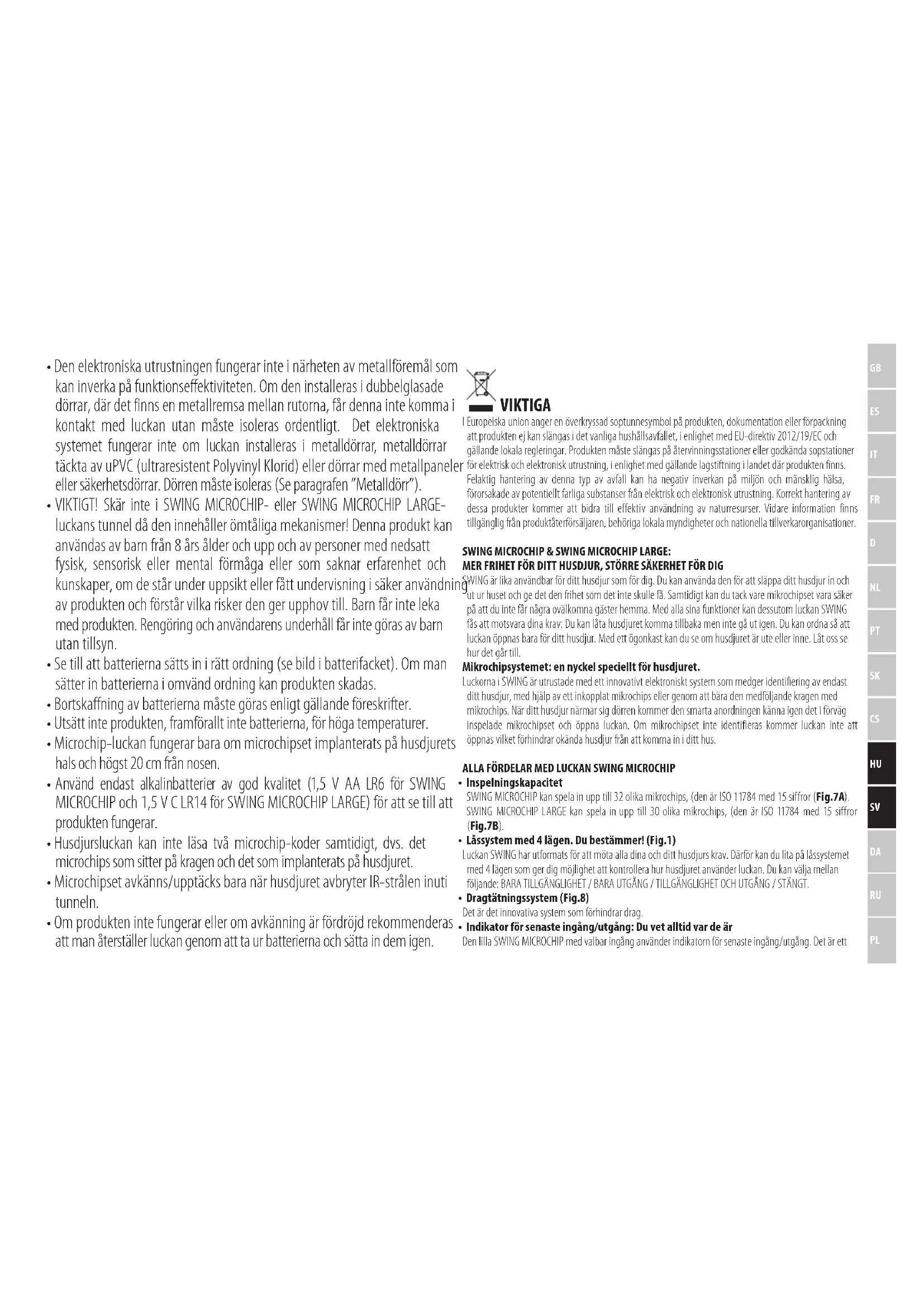 - VIKTIGT! Skär inte i SWING MICROCHIP- eller SWING MICROCHIP LARGE-luckans tunnel då den innehåller ömtåliga mekanismer! Denna produkt kan användas av barn från 8 års ålder och upp och av personer med nedsatt fysisk, sensorisk eller mental förmåga eller som saknar erfarenhet och kunskaper, om de står under uppsikt eller fått undervisning i säker användnin av produkten och förstår vilka risker den ger upphov till. Barn får inte leka med produkten. Rengöring och användarens underhåll får inte göras av barn utan tillsyn.