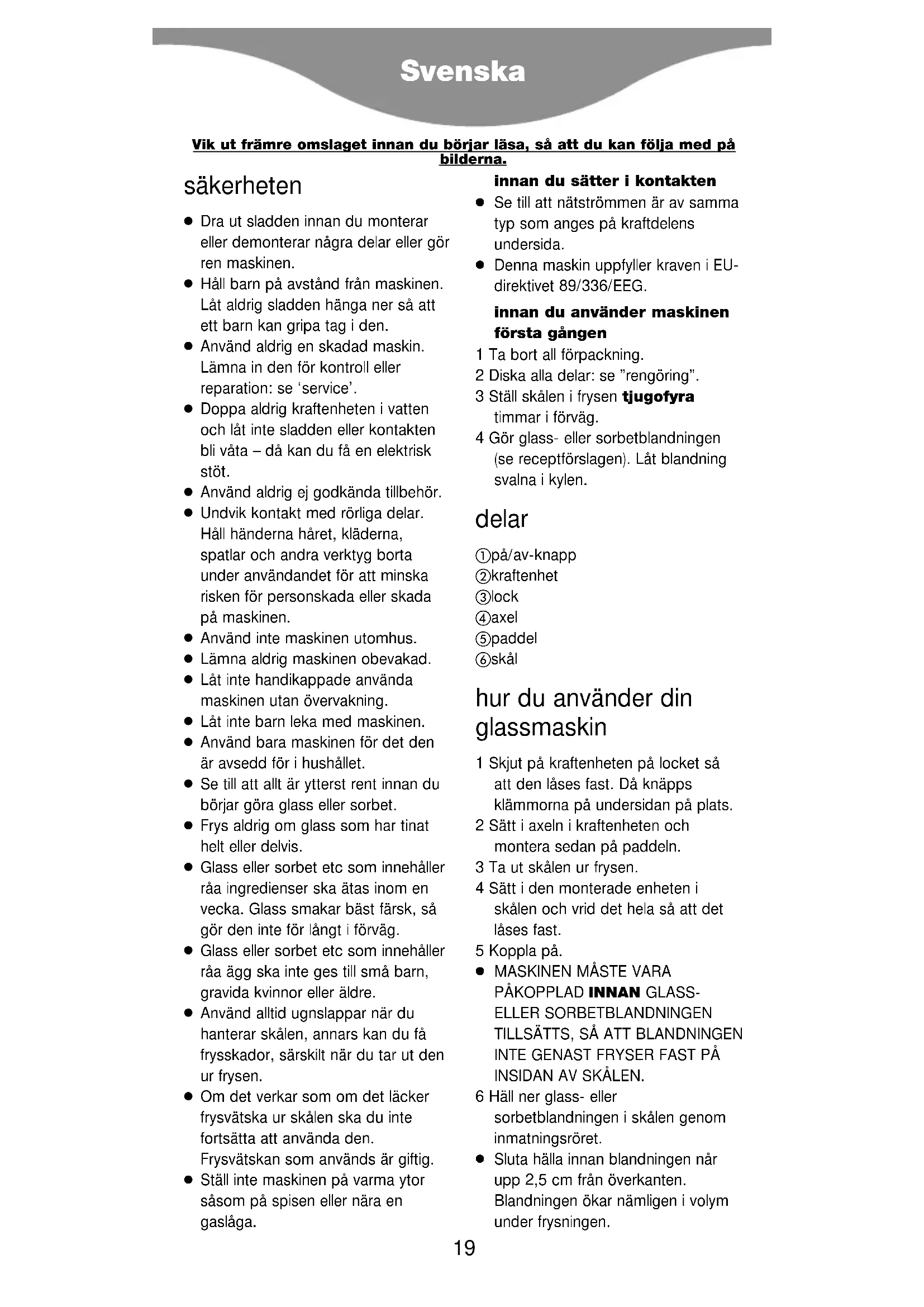 Svenska Vik ut främre omslaget innan du börjar läsa, så att du kan följa med på bilderna.7 Låt blandningen röras tills den är frusen eller tills önskad konsistens uppnåtts. Det kan ta ända till 30 till 40 minuter, men vid de flesta recept blir glassen färdig tidigare. viktigt