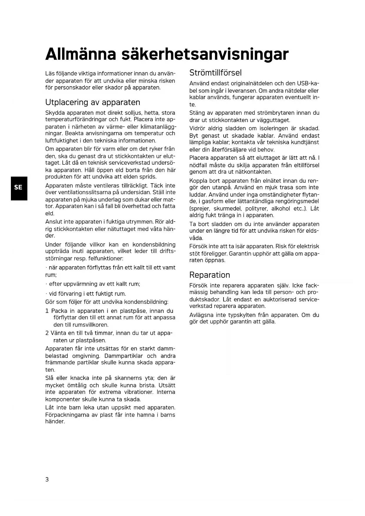 2 Allmänna säkerhetsanvisningar Utplacering av apparaten 3