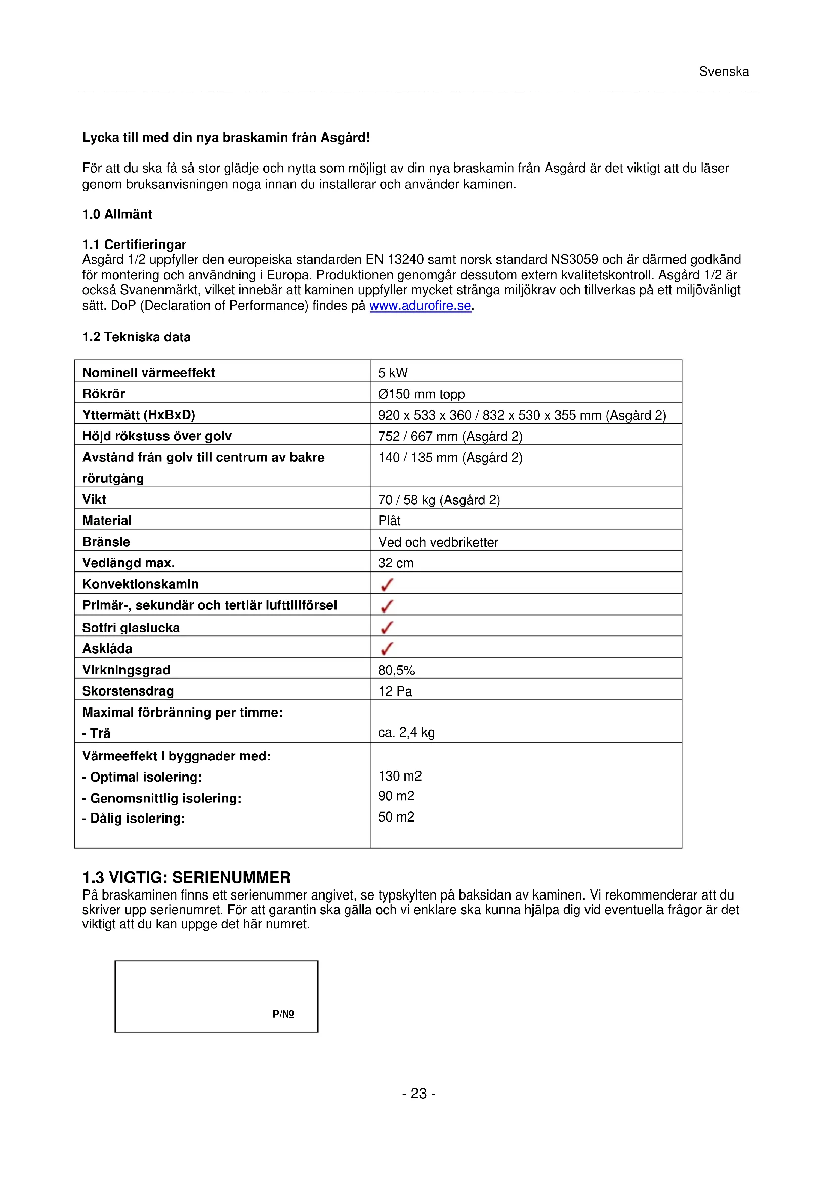 På braskaminen finns ett serienummer angivet, se typskylten på baksidan av kaminen. Vi rekommenderar att du skriver upp serienumret. För att garantin ska gälla och vi enklare ska kunna hjälpa dig vid eventuella frågor är det viktigt att du kan uppge det här numret. Svenska P/Nr._______________________________________________________________________________________________________________________________