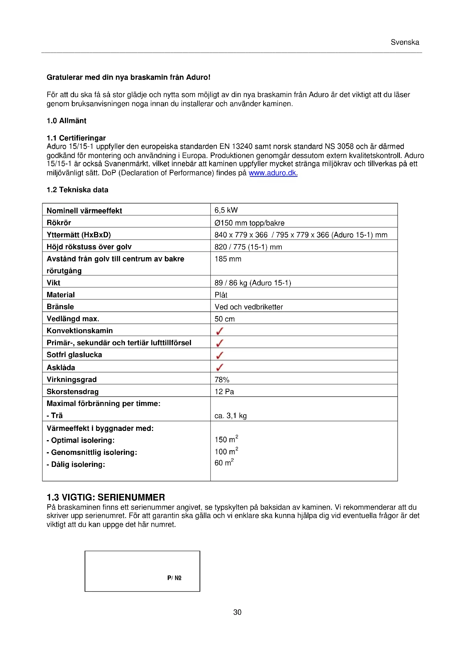 På braskaminen finns ett serienummer angivet, se typskylten på baksidan av kaminen. Vi rekommenderar att du skriver upp serienumret. För att garantin ska gälla och vi enklare ska kunna hjälpa dig vid eventuella frågor är det viktigt att du kan uppge det här numret. P/ Nr. Svenska_______________________________________________________________________________________________________________________________