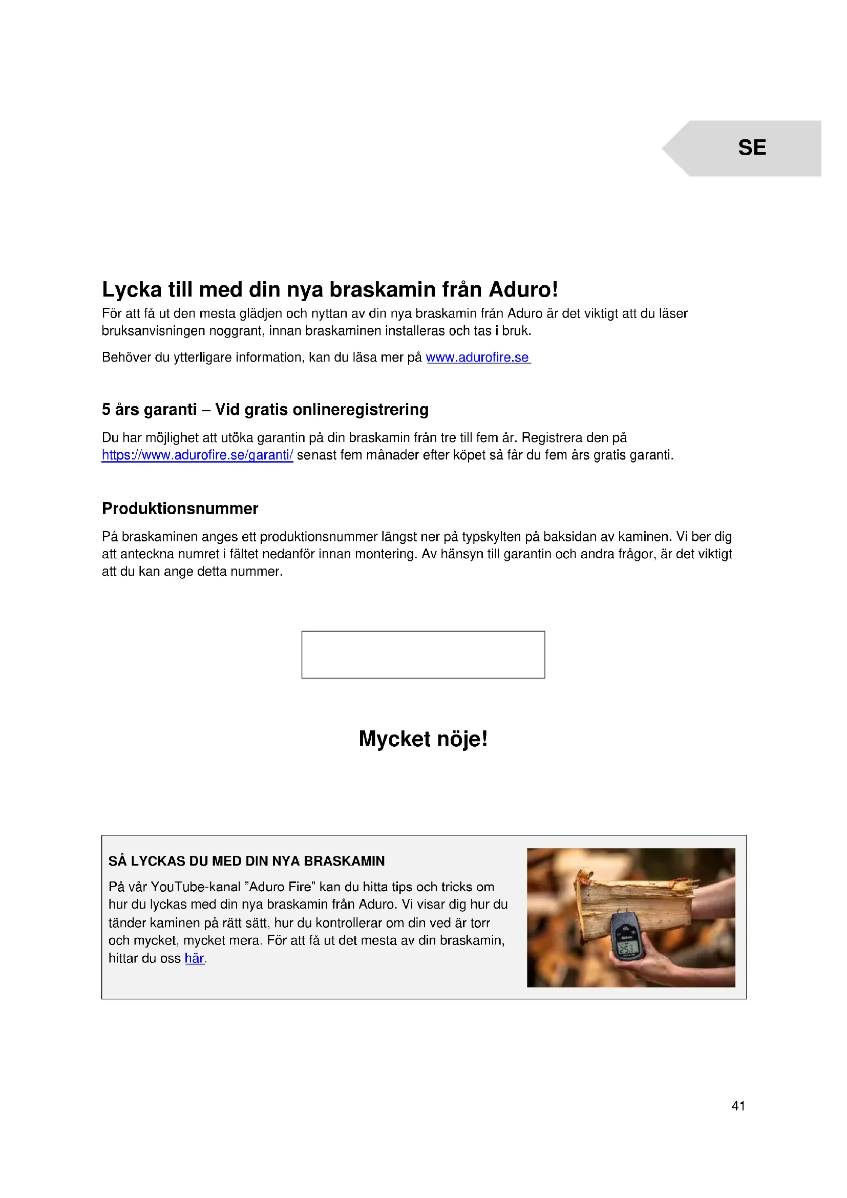 Lycka till med din nya braskamin från Aduro! För att få ut den mesta glädjen och nyttan av din nya braskamin från Aduro är det viktigt att du läser bruksanvisningen noggrant, innan braskaminen installeras och tas i bruk. Behöver du ytterligare information, kan du läsa mer på www.adurofire.se 5 års garanti – Vid gratis onlineregistrering Du har möjlighet att utöka garantin på din braskamin från tre till fem år. Registrera den på https://www.adurofire.se/garanti/ senast fem månader efter köpet så får du fem års gratis garanti. Produktionsnummer På braskaminen anges ett produktionsnummer längst ner på typskylten på baksidan av kaminen. Vi ber dig att anteckna numret i fältet nedanför innan montering. Av hänsyn till garantin och andra frågor, är det viktigt att du kan ange detta nummer.