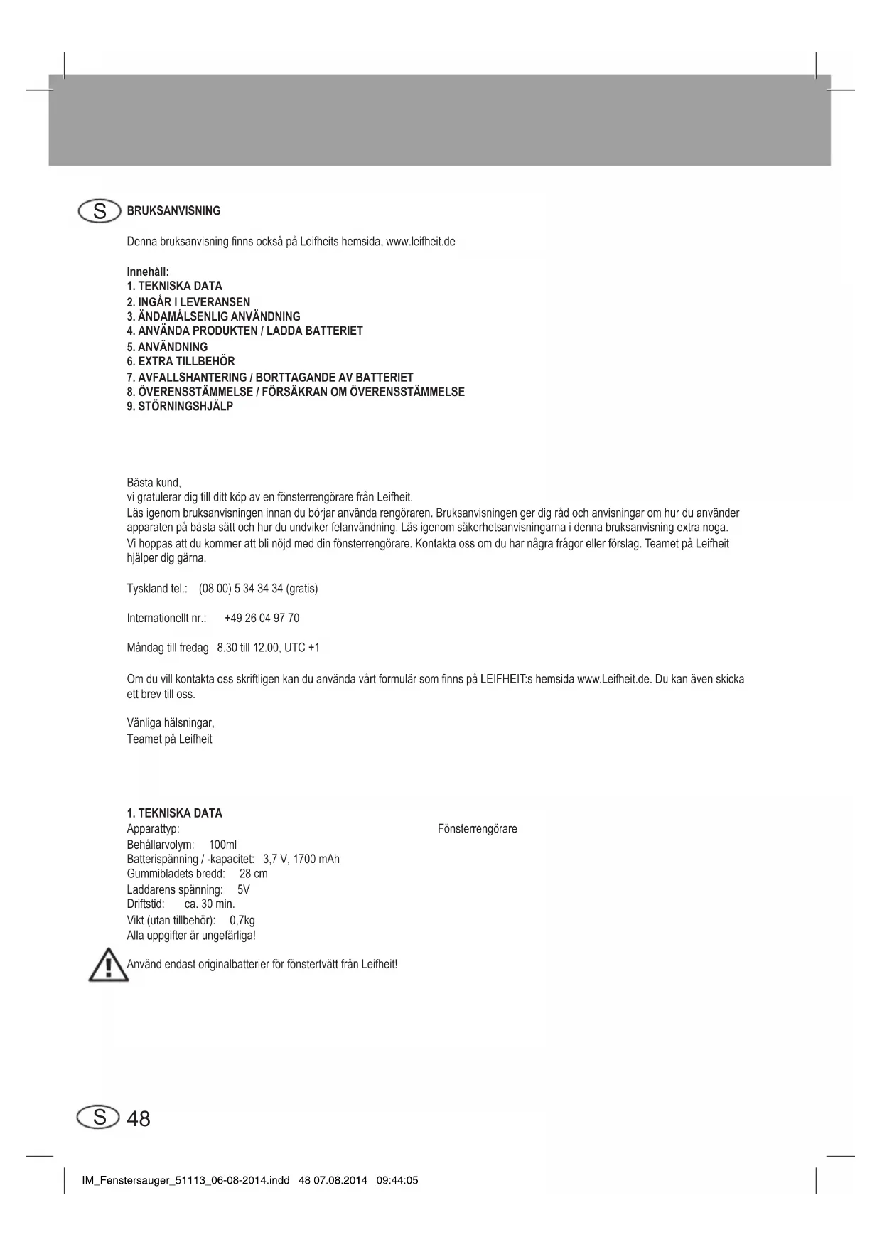 Bästa kund, vi gratulerar dig till ditt köp av en fönsterrengörare från Leifheit. Läs igenom bruksanvisningen innan du börjar använda rengöraren. Bruksanvisningen ger dig råd och anvisningar om hur du använder apparaten på bästa sätt och hur du undviker felanvändning. Läs igenom säkerhetsanvisningarna i denna bruksanvisning extra noga. Vi hoppas att du kommer att bli nöjd med din fönsterrengörare. Kontakta oss om du har några frågor eller förslag. Teamet på Leifheit hjälper dig gärna. Tyskland tel.: (08 00) 5 34 34 34 (gratis) Internationelltnr.: +4926049770 Måndag till fredag 8.30 till 12.00, UTC +1 OmduvillkontaktaossskriftligenkanduanvändavårtformulärsomnnspåLEIFHEIT:shemsidawww.Leifheit.de.Dukanävenskicka ett brev till oss. Vänliga hälsningar, Teamet på Leifheit