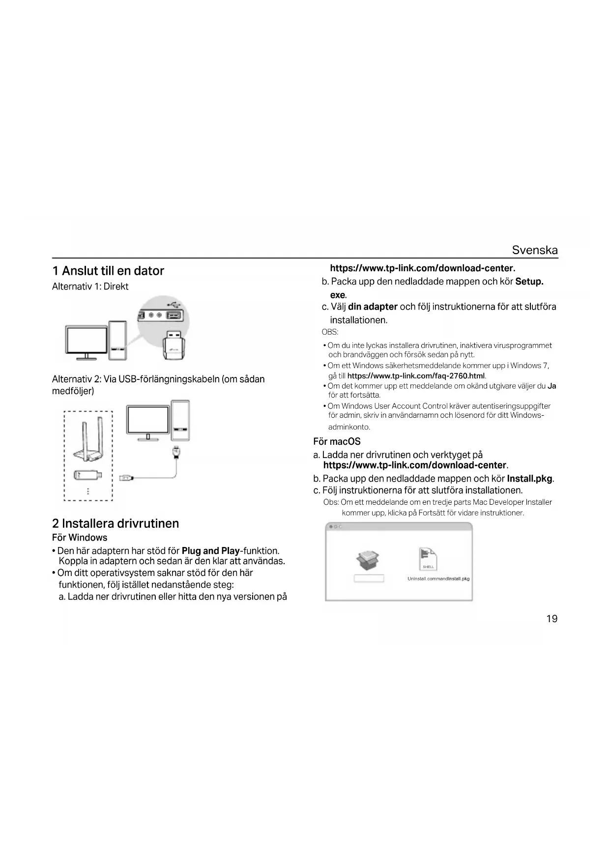 TP-Link_XXXX19 Svenska 1 Anslut till en dator Alternativ 1: Direkt Alternativ 2: Via USB-förlängningskabeln (om sådan medföljer) 2 Installera drivrutinen För Windows