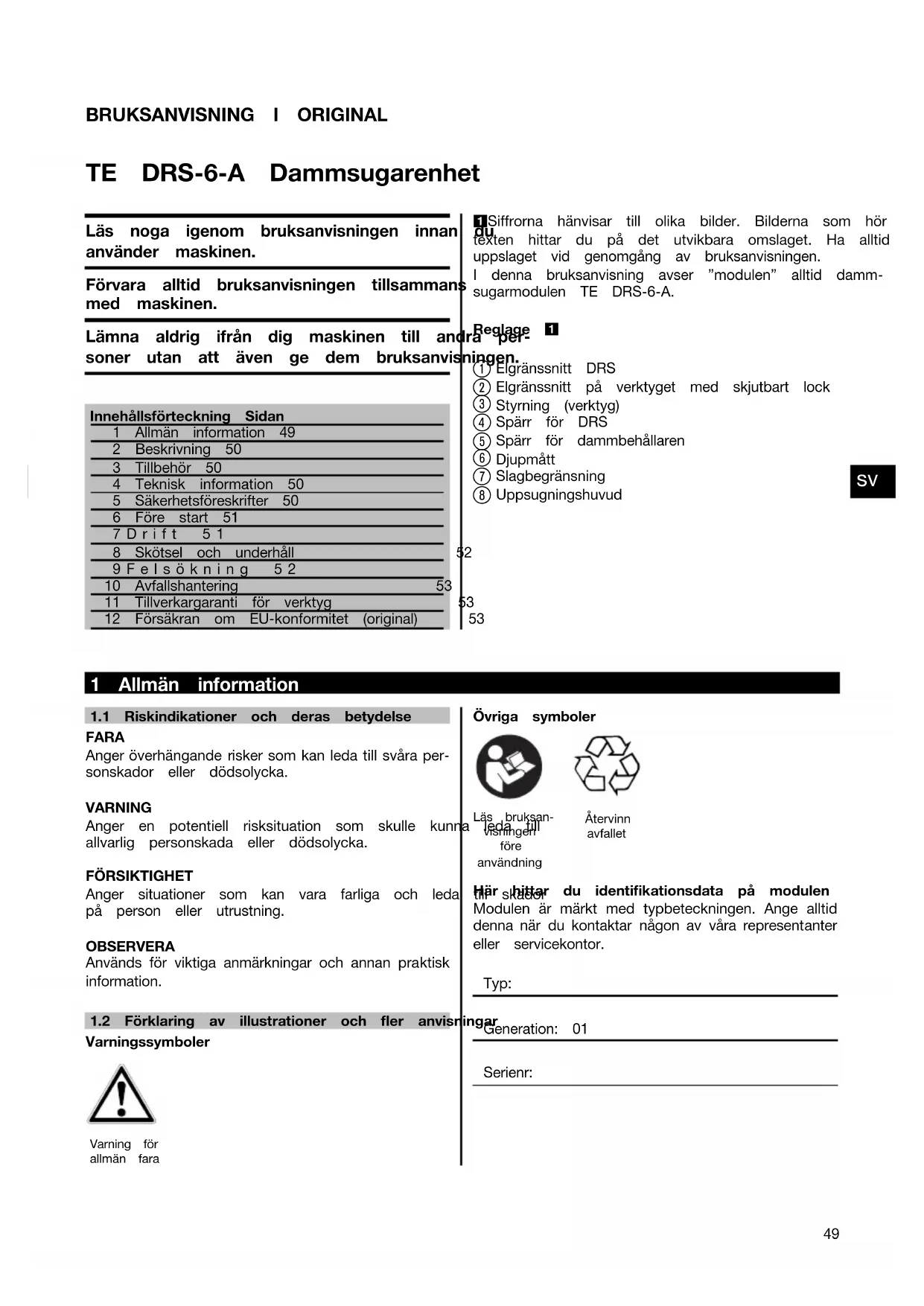 Printed: 08.07.2013 | Doc-Nr: PUB / 5071244 / 000 / 02BRUKSANVISNING I ORIGINAL TE DRS‑6‑A Dammsugarenhet Läs noga igenom bruksanvisningen innan du använder maskinen. Förvara alltid bruksanvisningen tillsammans med maskinen. Lämna aldrig ifrån dig maskinen till andra per- soner utan att även ge dem bruksanvisningen. Innehållsförteckning Sidan1 Allmän information 492 Beskrivning 503 Tillbehör 504 Teknisk information 505 Säkerhetsföreskrifter 506 Före start 517Drift 518 Skötsel och underhåll 529Felsökning 5210 Avfallshantering 5311 Tillverkargaranti för verktyg 5312 Försäkran om EU-konformitet (original) 531 Siffrorna hänvisar till olika bilder. Bilderna som hör tilltexten hittar du på det utvikbara omslaget. Ha alltid dettauppslaget vid genomgång av bruksanvisningen.I denna bruksanvisning avser ”modulen” alltid damm-sugarmodulen TE DRS‑6‑A.Reglage 1 Elgränssnitt DRS Elgränssnitt på verktyget med skjutbart lock Styrning (verktyg) Spärr för DRS Spärr för dammbehållaren Djupmått Slagbegränsning Uppsugningshuvud 1 Allmän information