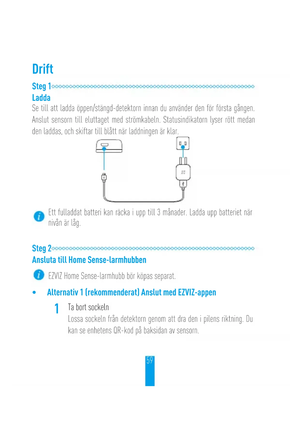10 dBm59 Drift Steg 1 Ladda Se till att ladda öppen/stängd-detektorn innan du använder den för första gången. Anslut sensorn till eluttaget med strömkabeln. Statusindikatorn lyser rött medan den laddas, och skiftar till blått när laddningen är klar. Ett fulladdat batteri kan räcka i upp till 3 månader. Ladda upp batteriet när nivån är låg. Steg 2 Ansluta till Home Sense-larmhubben EZVIZ Home Sense-larmhubb bör köpas separat.