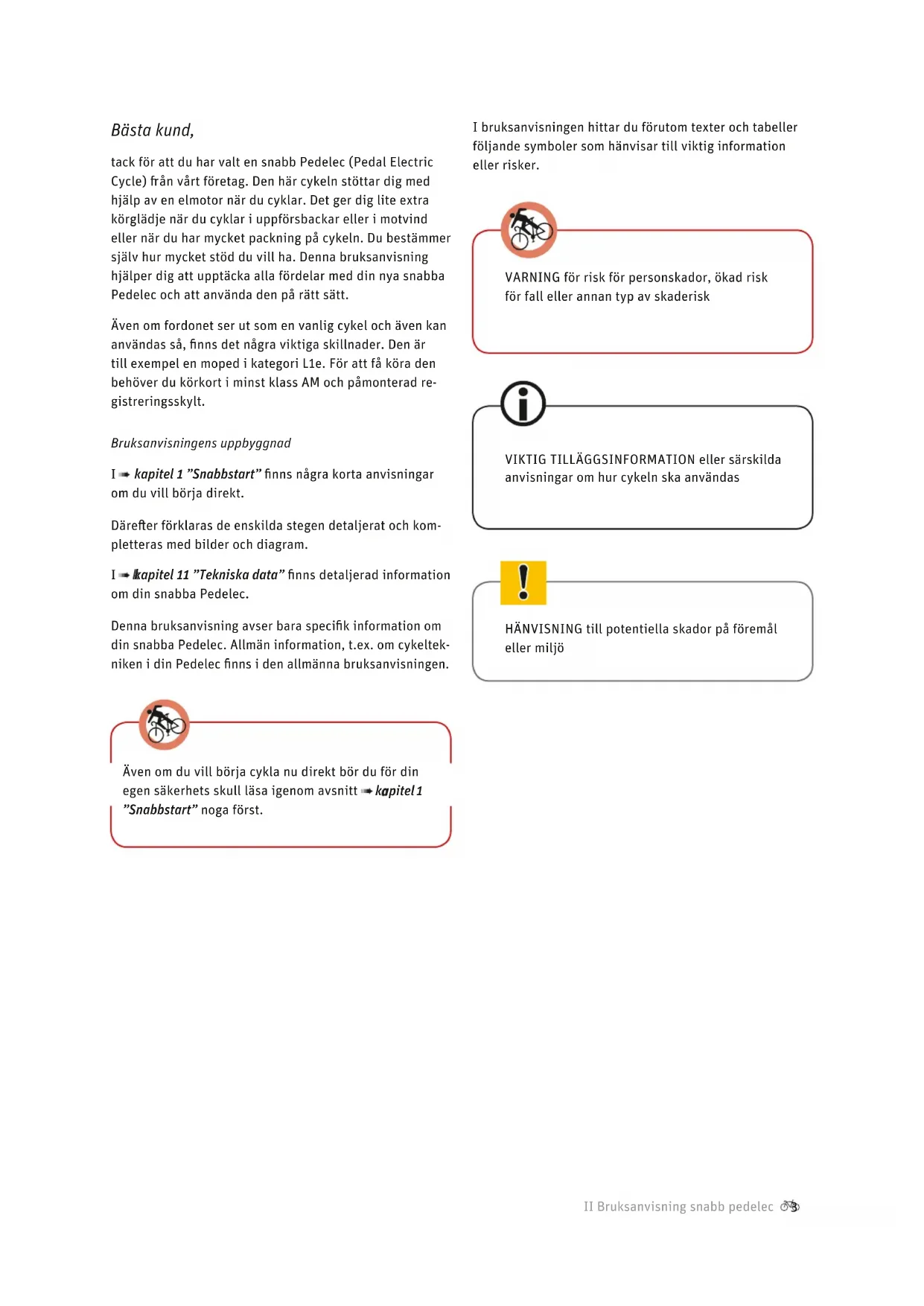 Denna bruksanvising avser bara spefik information om din snabba Pedelec. Allman information, t.ex. om cykeltek-niken i din Pedelec finns i den allmanna bruksanvisingen.