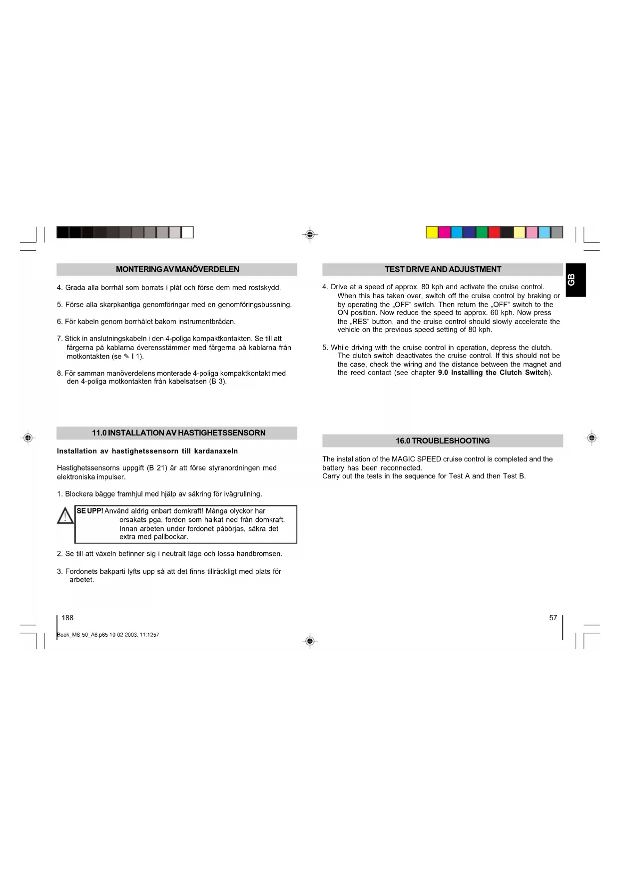 Kopplingsbrytaren kopplar ur hastighetsregulatorn. Om detta inte skulle vara fallet, kontrollera kabling och avståndet mellan magnet och reedkontakt (se punkt 9.0 Montering kopplingsbrytare.). Alla installationsarbeten för MAGIC-SPEED är avslutade och batteriet har åter anslutits. Genomför testet i ordningsföljden test A och sedan test B. Book_MS-50_A6.p65 10-02-2003, 11:1250GB