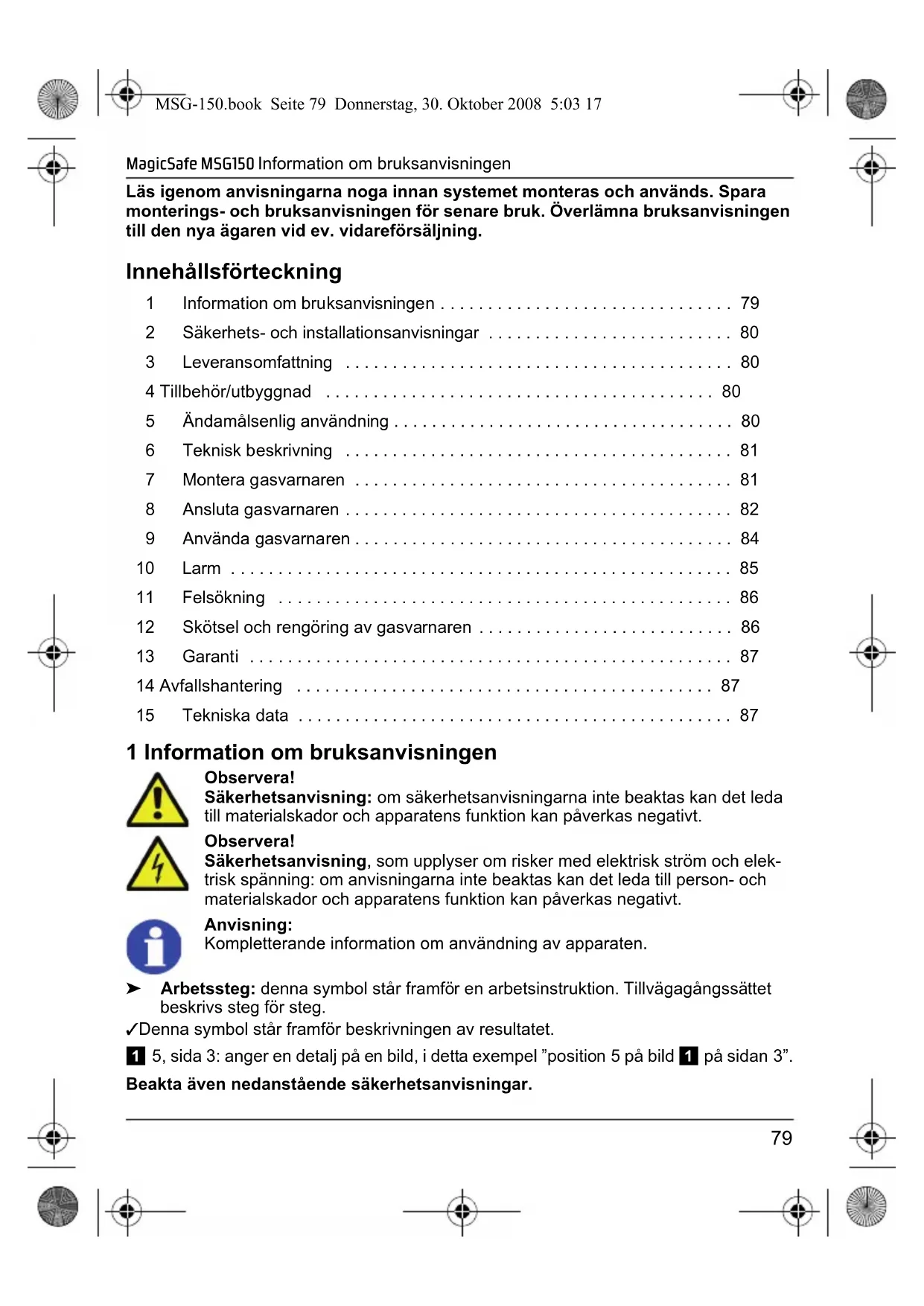 - 15 Tekniska data 1 Information om bruksanvisningen Observera! Säkerhetsanvisning: om säkerhetsanvisningarna inte beaktas kan det leda till materialskador och apparatens funktion kan påverkas negativt. Observera! Säkerhetsanvisning, som upplyser om risker med elektrisk ström och elek- trisk spänning: om anvisningarna inte beaktas kan det leda till person- och materialskador och apparatens funktion kan påverkas negativt. Anvisning: Kompletterande information om användning av apparaten. ➤ Arbetssteg: denna symbol står framför en arbetsinstruktion. Tillvägagångssättet beskrivs steg för steg. ✓ Denna symbol står framför beskrivningen av resultatet. 1 5, sida 3: anger en detalj på en bild, i detta exempel ”position 5 på bild 1 på sidan 3”. Beakta även nedanstående säkerhetsanvisningar. MSG-150.book Seite 79 Donnerstag, 30. Oktober 2008 5:03 17Säkerhets- och installationsanvisningar MagicSafe MSG150 p. 87