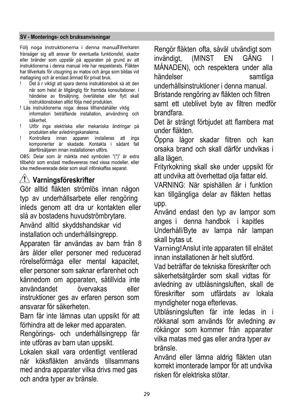 Funktion Fläkten är utrustad med en manöverpanel med en hastighetskontroll och en strömbrytare för spishällens belysning. Använd en högre hastighet om matoset är mycket koncentrerat. Vi rekommenderar att starta luftevakueringen 5 minuter innan matlagningen inleds och låta den fungera i cirka 15 minuter efter avslutad matlagning. Underhåll Rengöring Använd endast en trasa fuktad med neutrala rengöringsmedel vid rengöring. Använd inte några verktyg eller instrument för rengöringen! Undvik produkter som innehåller slipmedel. ANVÄND INTE ALKOHOL! Fettfilter Detta suger upp fettpartiklar som bildas i samband med matlagningen. Filtret skall rengöras en gång i månaden, med ett milt rengöringsmedel, för hand eller i diskmaskin, med låg temperatur och kort program. Vi tvätt i diskmaskin kan fettfiltret av metall missfärgas utan att detta på något sätt påverkar filtrets uppsugningsförmåga. När filtret skall monteras ur drar man i handtaget som lossas med hjälp av en fjäder. Fig. 1 Kolfilter (gäller endast filterversionen) Fig. 2 Kolltret fångar upp obehagliga odörer som uppstår i samband med matlagningen. Kolltret mättas efter en mer eller mindre lång tidsperiod beroende på i vilken utsträckning fläkten används, på typen av matlagning och hur regelbundet fettfiltren rengörs. Det är under alla händelser nödvändigt att ersätta kolfilterpatronen minst var 4 månad. Filtret kan INTE rengöras eller återanvändas. Ta ur fettfiltren. Montera filtren som täcker motorn. Kontrollera att tapparna R på luftavledaren sammanfaller med springorna S, vrid avslutningsvis medurs till filtret blockeras. Följ instruktionerna i omvänd ordning vid nedmontering. Sett tillbaka fettfiltren. Byte av Lampor Fig. 1 Koppla ur apparaten från elnätet. Varning! Kontrollera att lamporna har svalnat innan ni vidrör dem. Byt ut den trasiga lampan med en lampa av samma typ enligt anvisningarna på märkplåten eller intill fläktens lampa. Avlägsna locket A för att göra utrymmet där lamporna sitter åtkomligt. I det fall belysningen inte fungerar, kontrollera att lamporna är korrekt iskruvade i sitt säte innan ni kontaktar det tekniska servicekontoret.32 NO - Instrukser for montering og bruk Instruksjonene i denne håndboken må følges nøye. Produsenten fraskriver seg ethvert ansvar for eventuelle uhell, skader eller brann på apparatet som skyldes at bruksanvisningen i denne håndboken ikke har blitt overholdt. Ventilatoren er ment for avtrekk av røyk og damp fra matlaging og er kun til husholdningsbruk. ! Det er viktig å oppbevare denne håndboken for å kunne konsultere den i ethvert øyeblikk. Ved salg, overdragelse eller flytting av produktet, må man forsikre seg om at den følger med. ! Les bruksanvisningen nøye: den inneholder viktige informasjoner om installasjon, bruk og sikkerhet. ! Ikke utfør elektriske eller mekaniske endringer på produktet eller på avtrekksrørene. ! Før man fortsetter med installasjon av apparatet, skal man undersøke at ingen komponenter er skadet. Hvis det skulle være skade på komponentene, skal man ta kontakt med forhandleren og ikke fortsette med installasjonen. MERK: De delene som er merket med symbolet “(*)” er ekstrautstyr som kun leveres med noen modeller, eller er deler som ikke leveres, men må anskaffes separat. Advarsel Før det utføres et hvilket som helst vedlikehold eller rengjøring må hetten kobles fra strømmen, enten ved å dra ut støpselet eller ved å kutte strømmen i hele huset. Bruk alltid arbeidshansker under hele installasjonen og når det utføres vedlikehold. Dette apparatet kan benyttes av barn fra 8 år og oppover og av personer med svekkede fysiske, følelsesmessige eller mentale egenskaper, eller manglende erfaring og kjennskap, hvis de overvåkes eller hvis de er opplært til å ta apparatet i bruk på en sikker måte og er informert om tilhørende farer. Pass på at barn ikke leker med apparatet. Rengjøring og vedlikehold må ikke utføres av barn, med mindre de overvåkes. Rommet må være tilstrekkelig ventilert hvis hetten anvendes sammen med andre apparater som forbrenner gass eller annet brensel. Hetten må vaskes ofte både innvendig og utvendig (MINST EN GANG I MÅNEDEN), overhold uansett indikasjonene som er oppført i vedlikeholdsinstruksjonene i denne veiledningen. Manglende overholdelse av reglene for rengjøring av hetten og utbytting og rengjøring av filter, kan føre til brann. Det er strengt forbudt å lage flambert mat under hetten. Frie flammer kan skade filtrene og medføre brann og må derfor alltid unngås. Frityrsteking må overvåkes for å unngå