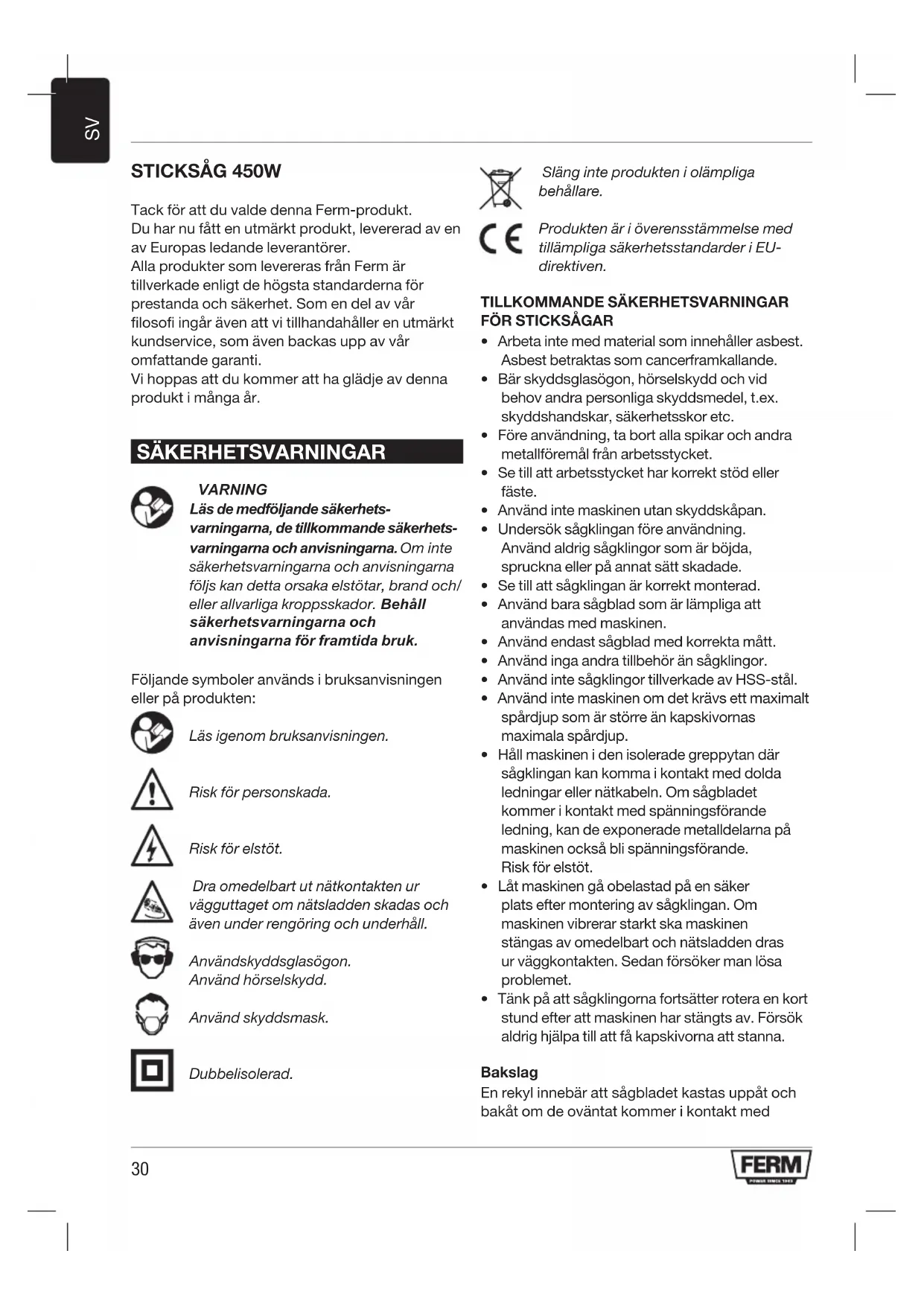 Tack för att du valde denna Ferm-produkt. Du har nu fått en utmärkt produkt, levererad av en av Europas ledande leverantörer. Alla produkter som levereras från Ferm är tillverkade enligt de högsta standarderna för prestanda och säkerhet. Som en del av vår filosofi ingår även att vi tillhandahåller en utmärkt kundservice, som även backas upp av vår omfattande garanti. Vi hoppas att du kommer att ha glädje av denna produkt i många år. SÄKERHETSVARNINGAR VARNING Läs de medföljande säkerhets- varningarna, de tillkommande säkerhets- varningarna och anvisningarna. Om inte säkerhetsvarningarna och anvisningarna följs kan detta orsaka elstötar, brand och/ eller allvarliga kroppsskador. Behåll säkerhetsvarningarna och anvisningarna för framtida bruk. Följande symboler används i bruksanvisningen eller på produkten: Läs igenom bruksanvisningen. Risk för personskada. Risk för elstöt. Dra omedelbart ut nätkontakten ur vägguttaget om nätsladden skadas och även under rengöring och underhåll. Använd skyddsglasögon. Använd hörselskydd. Använd skyddsmask. Dubbelisolerad. Släng inte produkten i olämpliga behållare. Produkten är i överensstämmelse med tillämpliga säkerhetsstandarder i EU- direktiven.