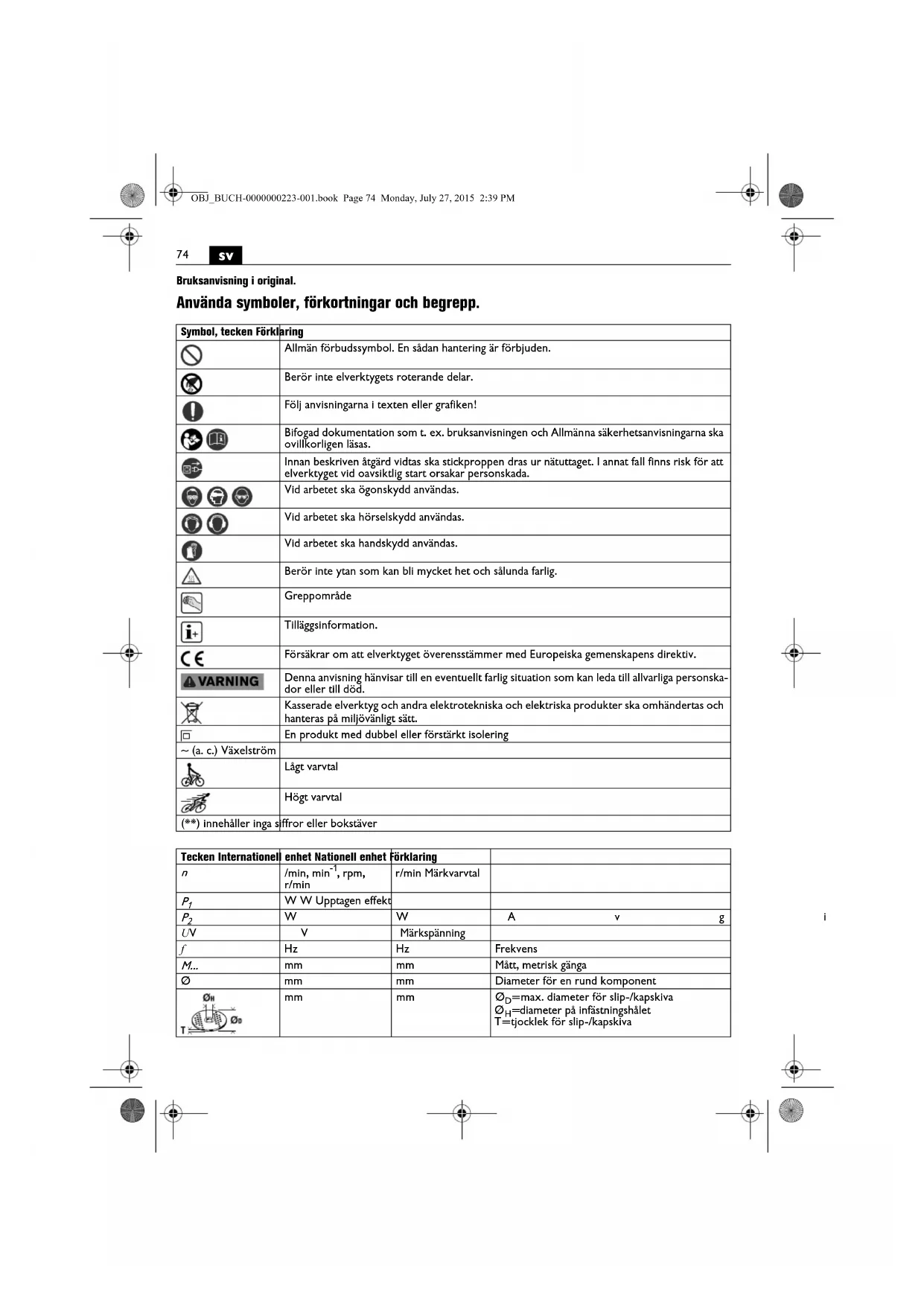 Bruksanvisning i original. Använda symboler, förkortningar och begrepp. Symbol, tecken Förklaring Allmän förbudssymbol. En sådan hantering är förbjuden. Berör inte elverktygets roterande delar. Följ anvisningarna i texten eller grafiken! Bifogad dokumentation som t. ex. bruksanvisningen och Allmänna säkerhetsanvisningarna ska ovillkorligen läsas. Innan beskriven åtgärd vidtas ska stickproppen dras ur nätuttaget. I annat fall finns risk för att elverktyget vid oavsiktlig start orsakar personskada. Vid arbetet ska ögonskydd användas. Vid arbetet ska hörselskydd användas. Vid arbetet ska handskydd användas. Berör inte ytan som kan bli mycket het och sålunda farlig. Greppområde Tilläggsinformation. Försäkrar om att elverktyget överensstämmer med Europeiska gemenskapens direktiv. Denna anvisning hänvisar till en eventuellt farlig situation som kan leda till allvarliga personska- dor eller till död. Kasserade elverktyg och andra elektrotekniska och elektriska produkter ska omhändertas och hanteras på miljövänligt sätt. En produkt med dubbel eller förstärkt isolering ~ (a. c.) Växelström Lågt varvtal Högt varvtal (**) innehåller inga siffror eller bokstäver Tecken Internationell enhet Nationell enhet Förklaring