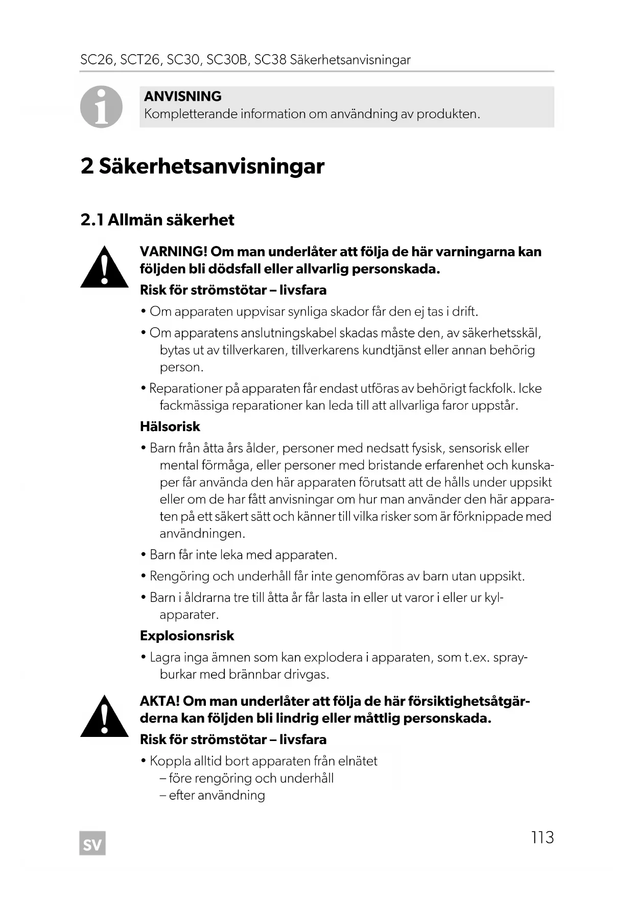 - Koppla alltid bort apparaten från elnätet – före rengöring och underhåll – efter användning ANVISNING Kompletterande information om användning av produkten. SC26-SCT26-SC30-SC38_OPM_EMEA16.book Seite 113 Mittwoch, 19. Juni 2019 8:51 20SV Säkerhetsanvisningar SC26, SCT26, SC30, SC30B, SC38