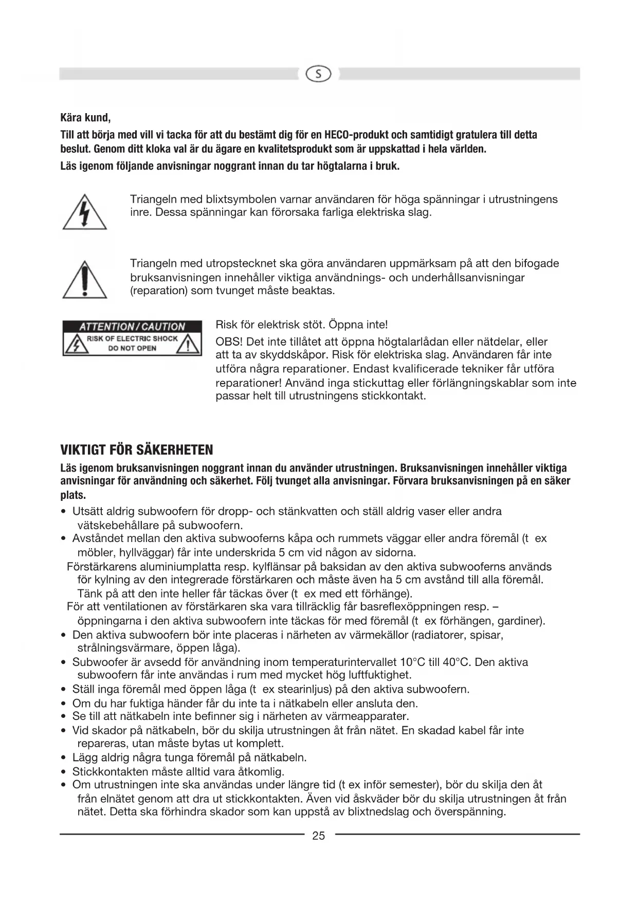 - Hz regulável 50 Hz regulável Dimensões (LxAxP): 380 x 442 x 435 mm 270 x 285 x 305 mm Acessórios: Cabo de ligação à rede Cabo de ligação à rede RESERVADOS OS DIREITOS DE ALTERAÇÕES TÉCNICAS.25 Kära kund, Till att börja med vill vi tacka för att du bestämt dig för en HECO-produkt och samtidigt gratulera till detta beslut. Genom ditt kloka val är du ägare en kvalitetsprodukt som är uppskattad i hela världen. Läs igenom följande anvisningar noggrant innan du tar högtalarna i bruk. Triangeln med blixtsymbolen varnar användaren för höga spänningar i utrustningens inre. Dessa spänningar kan förorsaka farliga elektriska slag. Triangeln med utropstecknet ska göra användaren uppmärksam på att den bifogade bruksanvisningen innehåller viktiga användnings- och underhållsanvisningar (reparation) som tvunget måste beaktas. Risk för elektrisk stöt. Öppna inte! OBS! Det inte tillåtet att öppna högtalarlådan eller nätdelar, eller att ta av skyddskåpor. Risk för elektriska slag. Användaren får inte utföra några reparationer. Endast kvalicerade tekniker får utföra reparationer! Använd inga stickuttag eller förlängningskablar som inte passar helt till utrustningens stickkontakt. p. 150