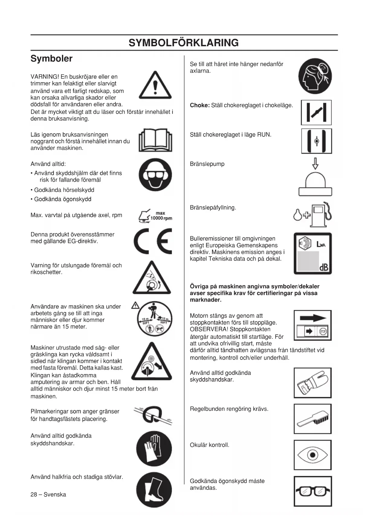 - Godkända ögonskydd Max. varvtal på utgående axel, rpm Denna produkt överensstämmer med gällande EG-direktiv. Varning för utslungade föremål och rikoschetter. Användare av maskinen ska under arbetets gång se till att inga människor eller djur kommer närmare än 15 meter. Maskiner utrustade med såg- eller gräsklinga kan rycka våldsamt i sidled när klingan kommer i kontakt med fasta föremål. Detta kallas kast. Klingan kan åstadkomma amputering av armar och ben. Håll alltid människor och djur minst 15 meter bort från maskinen. Pilmarkeringar som anger gränser för handtagsfästets placering. Använd alltid godkända skyddshandskar. Använd halkfria och stadiga stövlar. Se till att håret inte hänger nedanför axlarna. Choke: Ställ chokereglaget i chokeläge. Ställ chokereglaget i läge RUN. Bränslepump Bränslepåfyllning. Bulleremissioner till omgivningen enligt Europeiska Gemenskapens direktiv. Maskinens emission anges i kapitel Tekniska data och på dekal. Övriga på maskinen angivna symboler/dekaler avser specifika krav för certifieringar på vissa marknader. Motorn stängs av genom att stoppkontakten förs till stoppläge. OBSERVERA! Stoppkontakten återgår automatiskt till startläge. För att undvika ofrivillig start, måste därför alltid tändhatten avlägsnas från tändstiftet vid montering, kontroll och/eller underhåll. Använd alltid godkända skyddshandskar. Regelbunden rengöring krävs. Okulär kontroll. Godkända ögonskydd måste användas. 10000INNEHÅLL Svenska – 29 Innehåll Innan start måste följande observeras: Läs igenom bruksanvisningen noggrant. SYMBOLFÖRKLARING Symboler .............................................................. 28 INNEHÅLL Innehåll ................................................................. 29 Innan start måste följande observeras: ................ 29 INLEDNING Bäste kund! .......................................................... 30 VAD ÄR VAD? Vad är vad på trimmern och buskröjaren? ........... 31