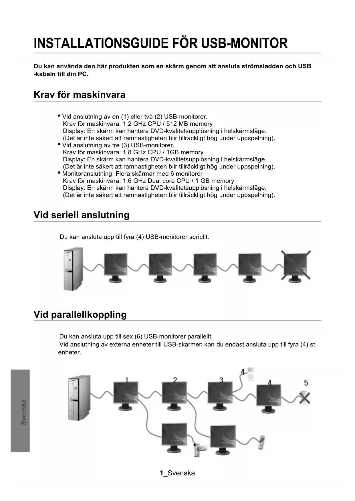 Du kan använda den här produkten som en skärm genom att ansluta strömsladden och USB -kabeln till din PC. Krav för maskinvara iVid anslutning av en (1) eller två (2) USB-monitorer. Krav för maskinvara: 1.2 GHz CPU / 512 MB memory Display: En skärm kan hantera DVD-kvalitetsupplösning i helskärmsläge. (Det är inte säkert att ramhastigheten blir tillräckligt hög under uppspelning). iVid anslutning av tre (3) USB-monitorer. Krav för maskinvara: 1.8 GHz CPU / 1GB memory Display: En skärm kan hantera DVD-kvalitetsupplösning i helskärmsläge. (Det är inte säkert att ramhastigheten blir tillräckligt hög under uppspelning). iMonitoranslutning: Flera skärmar med 6 monitorer Krav för maskinvara: 1.6 GHz Dual core CPU / 1 GB memory Display: En skärm kan hantera DVD-kvalitetsupplösning i helskärmsläge. (Det är inte säkert att ramhastigheten blir tillräckligt hög under uppspelning). Vid seriell anslutning Du kan ansluta upp till fyra (4) USB-monitorer seriellt. Vid parallellkoppling Du kan ansluta upp till sex (6) USB-monitorer parallellt. Vid anslutning av externa enheter till USB-skärmen kan du endast ansluta upp till fyra (4) st enheter. USB_Monitor_install_guide.fm Page 1 Wednesday, October 10, 2007 1:53 PM2_Svenska Svenska Installera USB-skärmen - Tänk på att ansluta USB-kabeln och inleda installationen efter att din PC startat. - Autoinstallationen tar omkring en minut. Om du slår av skärmen eller tar ut USB - kabeln under installationen kan det orsaka problem med din dator och Windows OS. - För rekommenderade upplösningar, se bruksanvisningen som medföljer på CD- skivan. Installation(Auto&Manuell) - Installationssättet kan ändras utan föregående meddelande i syfte att förbättra produkten.