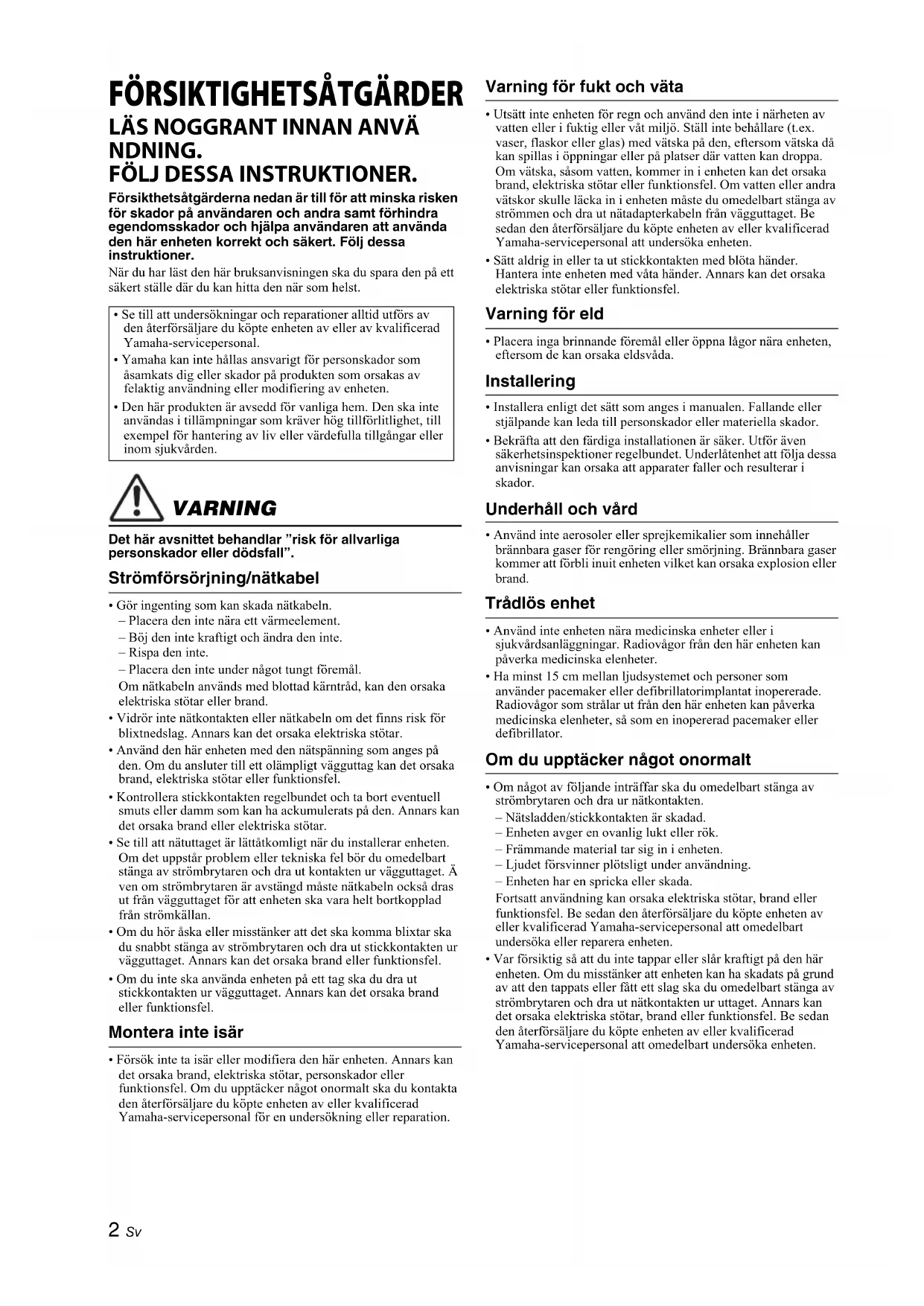 - Om något av följande inträffar ska du omedelbart stänga av strömbrytaren och dra ur nätkontakten. – Nätsladden/stickkontakten är skadad. – Enheten avger en ovanlig lukt eller rök. – Främmande material tar sig in i enheten. – Ljudet försvinner plötsligt under användning. – Enheten har en spricka eller skada. Fortsatt användning kan orsaka elektriska stötar, brand eller funktionsfel. Be sedan den återförsäljare du köpte enheten av eller kvalificerad Yamaha-servicepersonal att omedelbart undersöka eller reparera enheten.