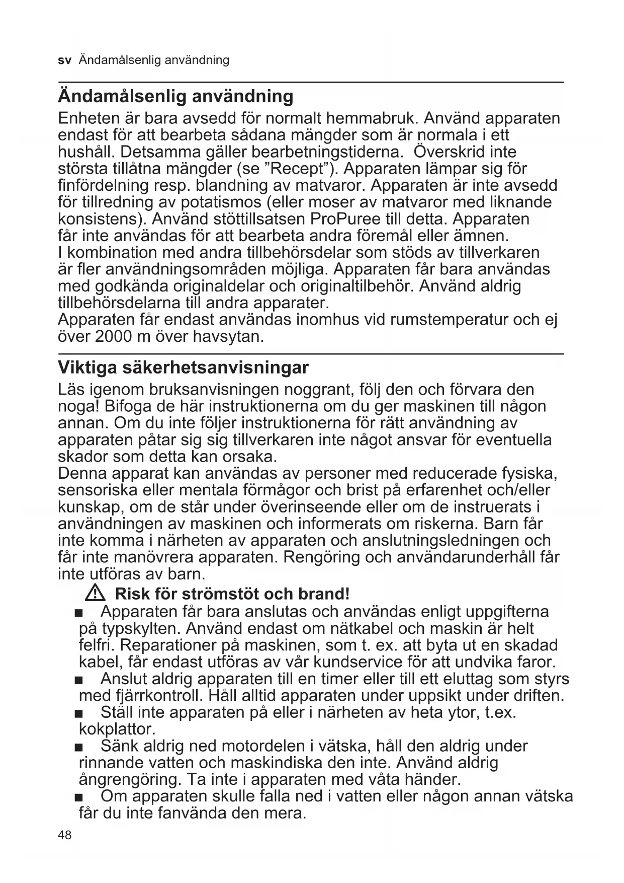 WEEE). Direktivet angir rammene for innlevering og gjenvinning av innbytteprodukter. Faghandelen kan gi opplysninger om aktuelle avfallsmottak. Garanti For dette apparatet gjelder de garantibe- tingelser som er oppgitt av vår representant i de respektive land. Detaljer om disse garantibetingelsene får du ved å henvende deg til elektrohandelen der du har kjøpt apparatet. Ved krav i forbindelse med garantiytelser, er det i alle fall nødvendig å legge fram kvittering for kjøpet av apparatet. Det tas forbehold om endringer.48 sv Ändamålsenlig användning Ändamålsenlig användning Enheten är bara avsedd för normalt hemmabruk. Använd apparaten endast för att bearbeta sådana mängder som är normala i ett hushåll. Detsamma gäller bearbetningstiderna. Överskrid inte största tillåtna mängder (se ”Recept”). Apparaten lämpar sig för finfördelning resp. blandning av matvaror. Apparaten är inte avsedd för tillredning av potatismos (eller moser av matvaror med liknande konsistens). Använd stöttillsatsen ProPuree till detta. Apparaten får inte användas för att bearbeta andra föremål eller ämnen. I kombination med andra tillbehörsdelar som stöds av tillverkaren är fler användningsområden möjliga. Apparaten får bara användas med godkända originaldelar och originaltilbehör. Använd aldrig tillbehörsdelarna till andra apparater. Apparaten får endast användas inomhus vid rumstemperatur och ej över 2000 m över havsytan. Viktiga säkerhetsanvisningar Läs igenom bruksanvisningen noggrant, följ den och förvara den noga! Bifoga de här instruktionerna om du ger maskinen till någon annan. Om du inte följer instruktionerna för rätt användning av apparaten påtar sig sig tillverkaren inte något ansvar för eventuella skador som detta kan orsaka. Denna apparat kan användas av personer med reducerade fysiska, sensoriska eller mentala förmågor och brist på erfarenhet och/eller kunskap, om de står under överinseende eller om de instruerats i användningen av maskinen och informerats om riskerna. Barn får inte komma i närheten av apparaten och anslutningsledningen och får inte manövrera apparaten. Rengöring och användarunderhåll får inte utföras av barn. W Risk för strömstöt och brand! ■ Apparaten får bara anslutas och användas enligt uppgifterna på typskylten. Använd endast om nätkabel och maskin är helt felfri. Reparationer på maskinen, som t. ex. att byta ut en skadad kabel, får endast utföras av vår kundservice för att undvika faror. ■ Anslut aldrig apparaten till en timer eller till ett eluttag som styrs med fjärrkontroll. Håll alltid apparaten under uppsikt under driften. ■ Ställ inte apparaten på eller i närheten av heta ytor, t.ex. kokplattor. ■ Sänk aldrig ned motordelen i vätska, håll den aldrig under rinnande vatten och maskindiska den inte. Använd aldrig ångrengöring. Ta inte i apparaten med våta händer. ■ Om apparaten skulle falla ned i vatten eller någon annan vätska får du inte fanvända den mera.49