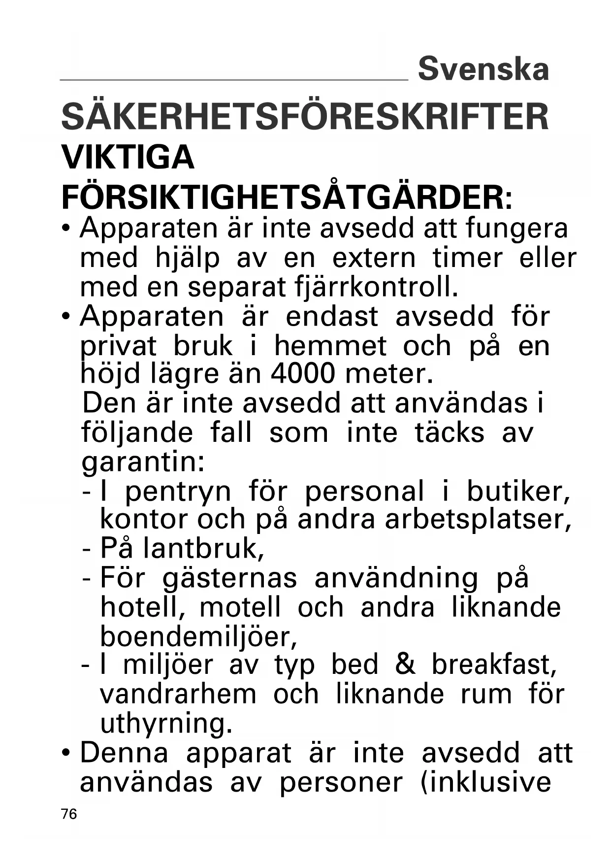 - Apparaten är endast avsedd för privat bruk i hemmet och på en höjd lägre än 4000 meter. Den är inte avsedd att användas i följande fall som inte täcks av garantin: - I pentryn för personal i butiker, kontor och på andra arbetsplatser, - På lantbruk, - För gästernas användning på hotell, motell och andra liknande boendemiljöer,