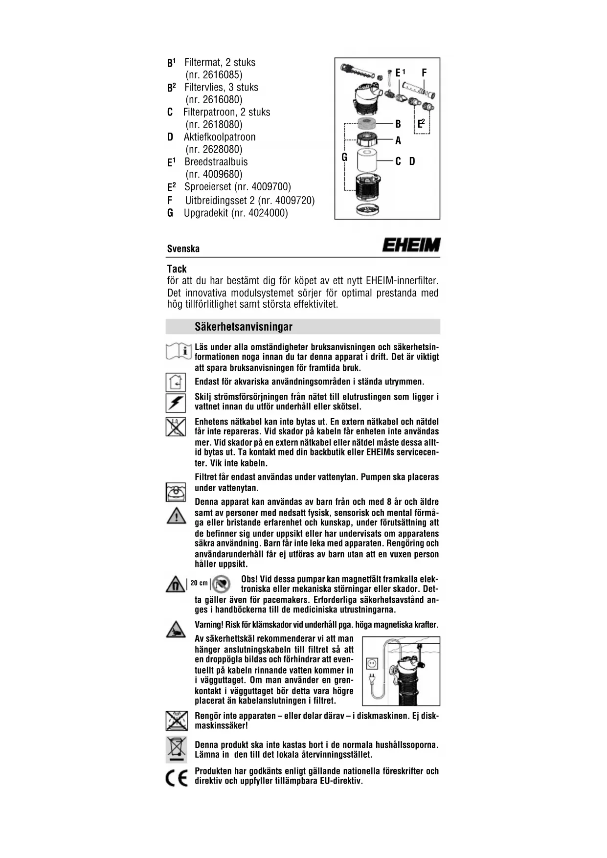 Läs under alla omständigheter bruksanvisningen och säkerhetsin- formationen noga innan du tar denna apparat i drift. Det är viktigt att spara bruksanvisningen för framtida bruk. Endast för akvariska användningsområden i stända utrymmen. Skilj strömsförsörjningen från nätet till elutrustingen som ligger i vattnet innan du utför underhåll eller skötsel. Enhetens nätkabel kan inte bytas ut. En extern nätkabel och nätdel får inte repareras. Vid skador på kabeln får enheten inte användas mer. Vid skador på en extern nätkabel eller nätdel måste dessa allt- id bytas ut. Ta kontakt med din backbutik eller EHEIMs servicecen- ter. Vik inte kabeln. Filtret får endast användas under vattenytan. Pumpen ska placeras under vattenytan. Denna apparat kan användas av barn från och med 8 år och äldre samt av personer med nedsatt fysisk, sensorisk och mental förmå- ga eller bristande erfarenhet och kunskap, under förutsättning att de befinner sig under uppsikt eller har undervisats om apparatens säkra användning. Barn får inte leka med apparaten. Rengöring och användarunderhåll får ej utföras av barn utan att en vuxen person håller uppsikt. Obs! Vid dessa pumpar kan magnetfält framkalla elek- troniska eller mekaniska störningar eller skador. Det- ta gäller även för pacemakers. Erforderliga säkerhetsavstånd an- ges i handböckerna till de mediciniska utrustningarna. Varning! Risk för klämskador vid underhåll pga. höga magnetiska krafter. Av säkerhettskäl rekommenderar vi att man hänger anslutningskabeln till filtret så att en droppögla bildas och förhindrar att even- tuellt på kabeln rinnande vatten kommer in i vägguttaget. Om man använder en gren- kontakt i vägguttaget bör detta vara högre placerat än kabelanslutningen i filtret. Rengör inte apparaten – eller delar därav – i diskmaskinen. Ej disk- maskinssäker!
