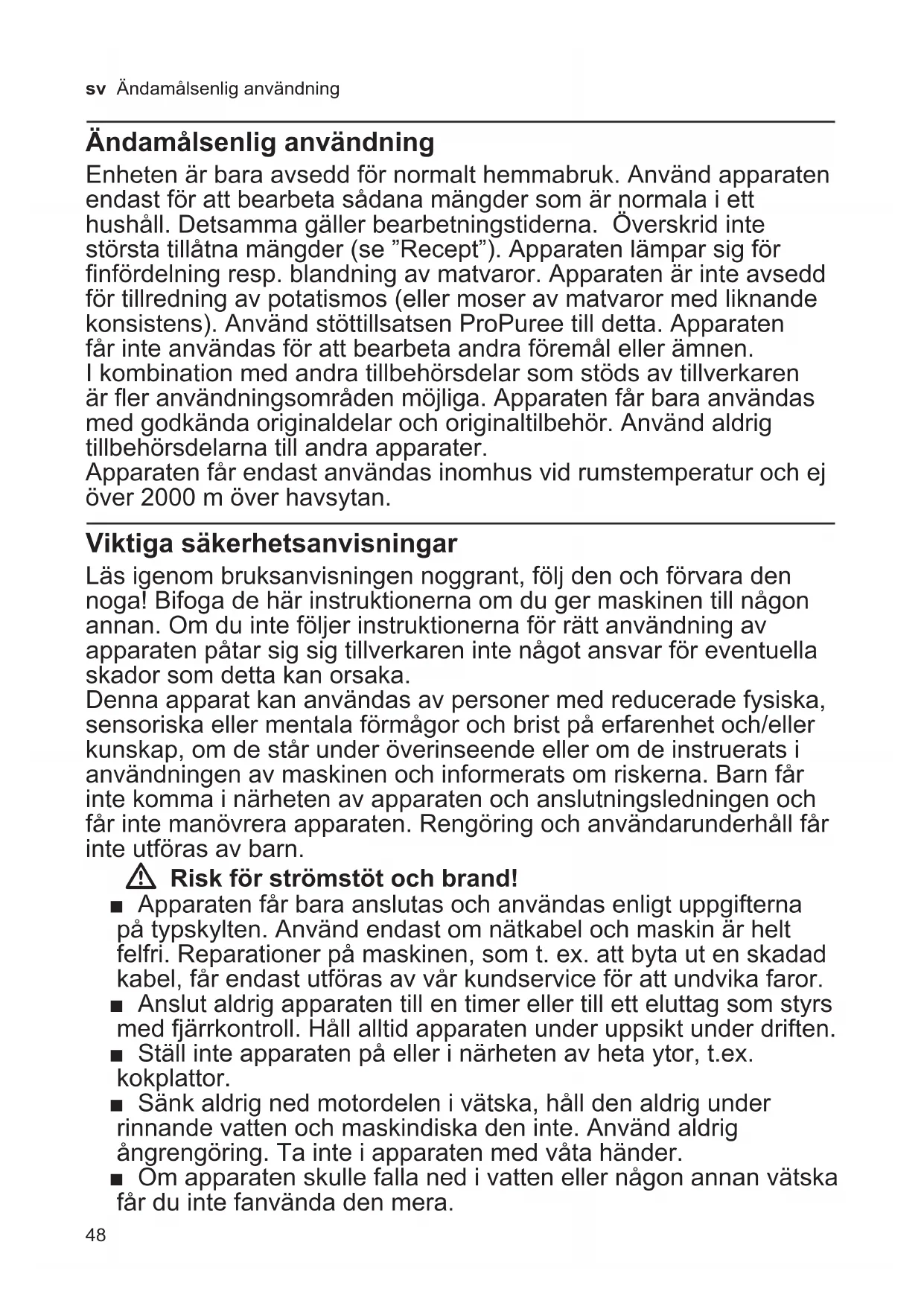 - WEEE). Direktivet angir rammene for innlevering og gjenvinning av innbytteprodukter. Faghandelen kan gi opplysninger om aktuelle avfallsmottak. Garanti For dette apparatet gjelder de garantibe- tingelser som er oppgitt av vår representant i de respektive land. Detaljer om disse garantibetingelsene får du ved å henvende deg til elektrohandelen der du har kjøpt apparatet. Ved krav i forbindelse med garantiytelser, er det i alle fall nødvendig å legge fram kvittering for kjøpet av apparatet. Det tas forbehold om endringer.48 sv Ändamålsenlig användning Ändamålsenlig användning Enheten är bara avsedd för normalt hemmabruk. Använd apparaten endast för att bearbeta sådana mängder som är normala i ett hushåll. Detsamma gäller bearbetningstiderna. Överskrid inte största tillåtna mängder (se ”Recept”). Apparaten lämpar sig för finfördelning resp. blandning av matvaror. Apparaten är inte avsedd för tillredning av potatismos (eller moser av matvaror med liknande konsistens). Använd stöttillsatsen ProPuree till detta. Apparaten får inte användas för att bearbeta andra föremål eller ämnen. I kombination med andra tillbehörsdelar som stöds av tillverkaren är fler användningsområden möjliga. Apparaten får bara användas med godkända originaldelar och originaltilbehör. Använd aldrig tillbehörsdelarna till andra apparater. Apparaten får endast användas inomhus vid rumstemperatur och ej över 2000 m över havsytan. Viktiga säkerhetsanvisningar Läs igenom bruksanvisningen noggrant, följ den och förvara den noga! Bifoga de här instruktionerna om du ger maskinen till någon annan. Om du inte följer instruktionerna för rätt användning av apparaten påtar sig sig tillverkaren inte något ansvar för eventuella skador som detta kan orsaka. Denna apparat kan användas av personer med reducerade fysiska, sensoriska eller mentala förmågor och brist på erfarenhet och/eller kunskap, om de står under överinseende eller om de instruerats i användningen av maskinen och informerats om riskerna. Barn får inte komma i närheten av apparaten och anslutningsledningen och får inte manövrera apparaten. Rengöring och användarunderhåll får inte utföras av barn. W Risk för strömstöt och brand! ■ Apparaten får bara anslutas och användas enligt uppgifterna på typskylten. Använd endast om nätkabel och maskin är helt felfri. Reparationer på maskinen, som t. ex. att byta ut en skadad kabel, får endast utföras av vår kundservice för att undvika faror. ■ Anslut aldrig apparaten till en timer eller till ett eluttag som styrs med fjärrkontroll. Håll alltid apparaten under uppsikt under driften. ■ Ställ inte apparaten på eller i närheten av heta ytor, t.ex. kokplattor. ■ Sänk aldrig ned motordelen i vätska, håll den aldrig under rinnande vatten och maskindiska den inte. Använd aldrig ångrengöring. Ta inte i apparaten med våta händer. ■ Om apparaten skulle falla ned i vatten eller någon annan vätska får du inte fanvända den mera.49 sv Viktiga säkerhetsanvisningar ■ Sänk inte ned mixerfoten längre i mixgodset än till markeringen Í. Risk för elektrisk stöt! ■ Dra alltid ut nätkabeln ur uttaget efter varje användning, när du inte har apparaten under uppsikt, före hopsättning, isärtagning eller rengöring och om ett fel skulle uppkomma. W Risk för personskador! ■ Dra alltid ut nätkabeln ur uttaget efter varje användning, när du inte har apparaten under uppsikt, före hopsättning, isärtagning eller rengöring och om ett fel skulle uppkomma. ■ Efter avstängning fortsätter drivuttaget att rotera en kort stund. Vänta tills drivningen står helt stilla. ■ Rör aldrig mixerfotskniven. Rengör aldrig mixerfotskniven med bara händer. W Risk för brännskador ■ Var försiktig när du bearbetar varma matvaror! Varma matvaror kan stänka omkring vid bearbetningen. W Kvävningsrisk! ■ Barn får inte leka med förpackningsmaterial. W Observera! ■ Vi rekommenderar dig att inte låta apparaten vara igång längre tid än vad som behövs för att bearbeta matvarorna. Låt inte apparaten gå på tomgång. ■ Mixerbägaren är inte avsedd att användas i mikrovågsugn. ■ Ställ aldrig mixerfoten på varma ytor och använd den inte till mycket varma matvaror. Låt kokande matvaror svalna till 80°C eller lägre före bearbetningen. Om du ska använda stavmixern i en kastrull måste du först ta bort kastrullen från spisplattan. W Viktigt! Du måste rengöra apparaten noggrant efter varje användning och om den inte har använts under en längre tid. X ”Skötsel och daglig rengöring” se sidan 5250 sv Innehåll Vi gratulerar dig till ditt köp av en ny apparat från Bosch. Mer information om våra produkter finns på vår Internet-sida. Så här använder du bruksanvisningen: Omslagssidorna går att vika ut. Där hittar du illustrationer med bokstäver och nummer, som det ofta hänvisas till i instruktionen (t.ex. X Bildserie B). Innehåll Ändamålsenlig användning p. 48