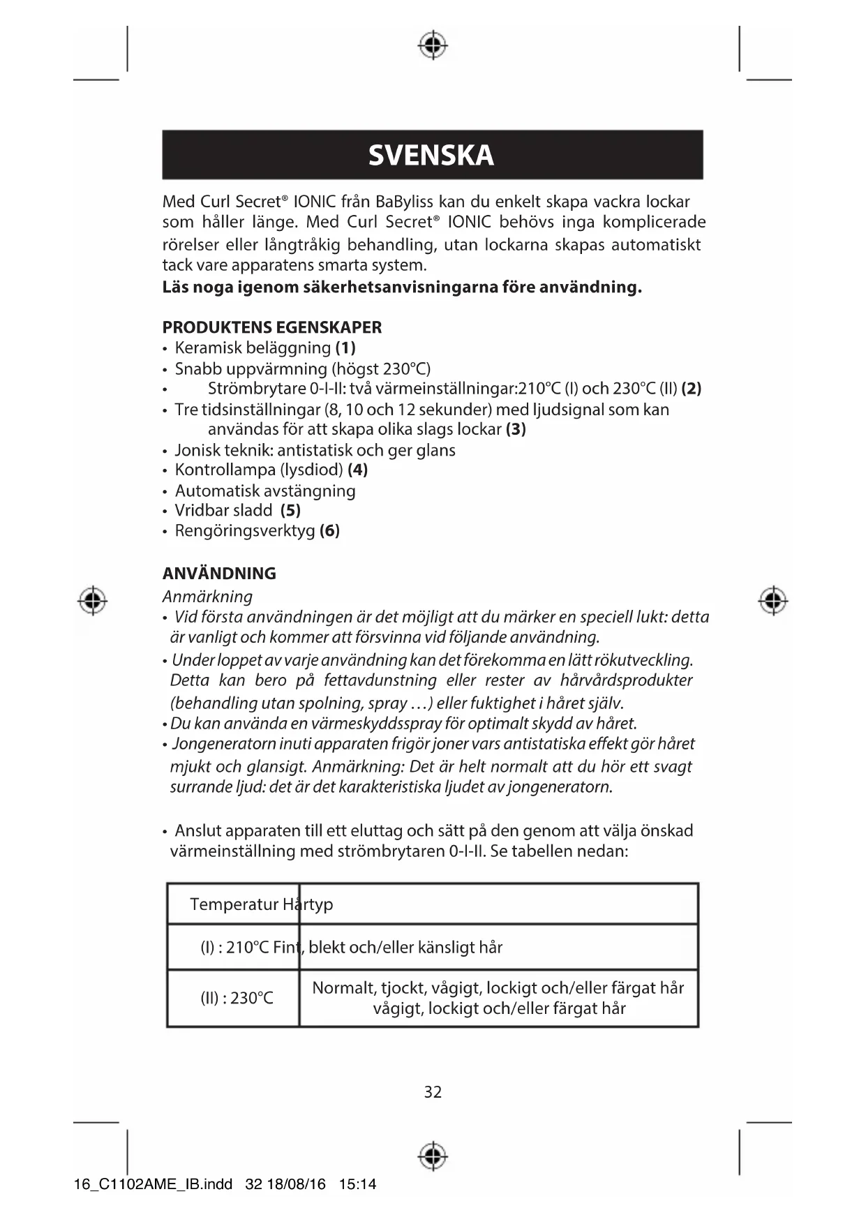 - Anslut apparaten till ett eluttag och sätt på den genom att välja önskad värmeinställning med strömbrytaren 0-I-II. Se tabellen nedan: Temperatur Hårtyp (I) : 210°C Fint, blekt och/eller känsligt hår (II) : 230°C Normalt, tjockt, vågigt, lockigt och/eller färgat hår vågigt, lockigt och/eller färgat hår 16_C1102AME_IB.indd 32 18/08/16 15:1433
