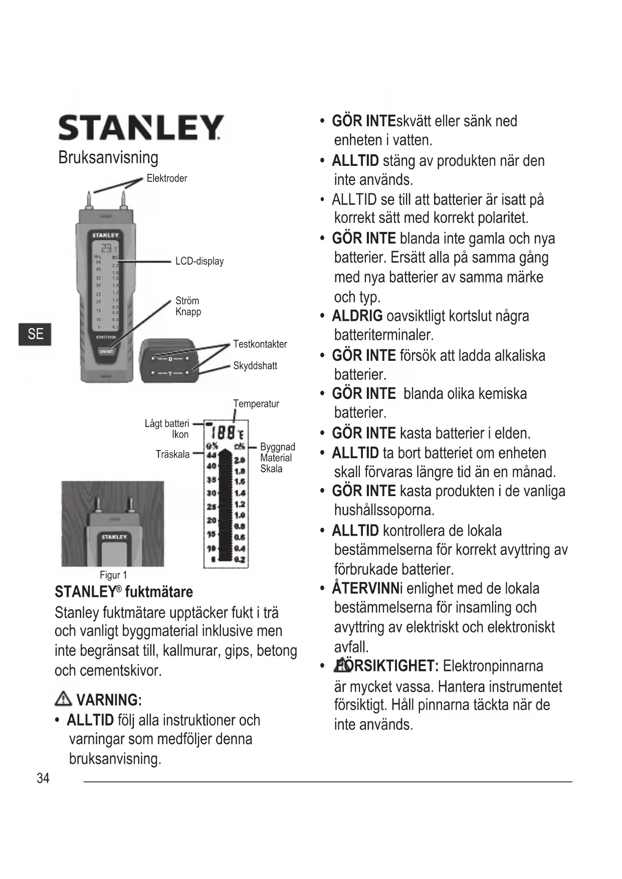 Stanley garantar er att de elektroniska matverktygen ar fria fran defekter i material och/eller tillverkning under ett ar fran inkopsdatumet.