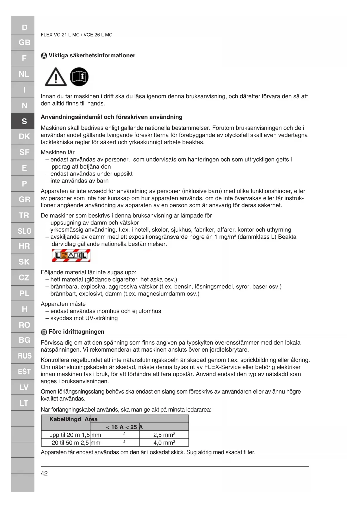FLEX VC 21 L MC / VCE 26 L MC Viktiga säkerhetsinformationer Innan du tar maskinen i drift ska du läsa igenom denna bruksanvisning, och därefter förvara den så att den alltid finns till hands. Användningsändamål och föreskriven användning Maskinen skall bedrivas enligt gällande nationella bestämmelser. Förutom bruksanvisningen och de i användarlandet gällande tvingande föreskrifterna för förebyggande av olycksfall skall även vedertagna facktekniska regler för säkert och yrkeskunnigt arbete beaktas. Maskinen får – endast användas av personer, som undervisats om hanteringen och som uttryckligen getts i ppdrag att betjäna den – endast användas under uppsikt – inte användas av barn Apparaten är inte avsedd för användning av personer (inklusive barn) med olika funktionshinder, eller av personer som inte har kunskap om hur apparaten används, om de inte övervakas eller får instruk- tioner angående användning av apparaten av en person som är ansvarig för deras säkerhet. De maskiner som beskrivs i denna bruksanvisning är lämpade för – uppsugning av damm och vätskor – yrkesmässig användning, t.ex. i hotell, skolor, sjukhus, fabriker, affärer, kontor och uthyrning – avskiljande av damm med ett expositionsgränsvärde högre än 1 mg/m³ (dammklass L) Beakta därvidlag gällande nationella bestämmelser. Följande material får inte sugas upp: – hett material (glödande cigaretter, het aska osv.) – brännbara, explosiva, aggressiva vätskor (t.ex. bensin, lösningsmedel, syror, baser osv.) – brännbart, explosivt, damm (t.ex. magnesiumdamm osv.) Apparaten måste – endast användas inomhus och ej utomhus – skyddas mot UV-strålning Före idrifttagningen Förvissa dig om att den spänning som finns angiven på typskylten överensstämmer med den lokala nätspänningen. Vi rekommenderar att maskinen ansluts över en jordfelsbrytare. Kontrollera regelbundet att inte nätanslutningskabeln är skadad genom t.ex. sprickbildning eller åldring. Om nätanslutningskabeln är skadad, måste denna bytas ut av FLEX-Service eller behörig elektriker innan maskinen tas i bruk, för att förhindra att fara uppstår. Använd endast den typ av nätsladd som anges i bruksanvisningen. Omen förlängsningsslang behövs ska endast en slang som föreskrivs av användaren eller av ännu högre kvalitet användas. När förlängningskabel används, ska man ge akt på minsta ledararea: Kabellängd Area < 16 A < 25 A upp til 20 m 1,5 mm