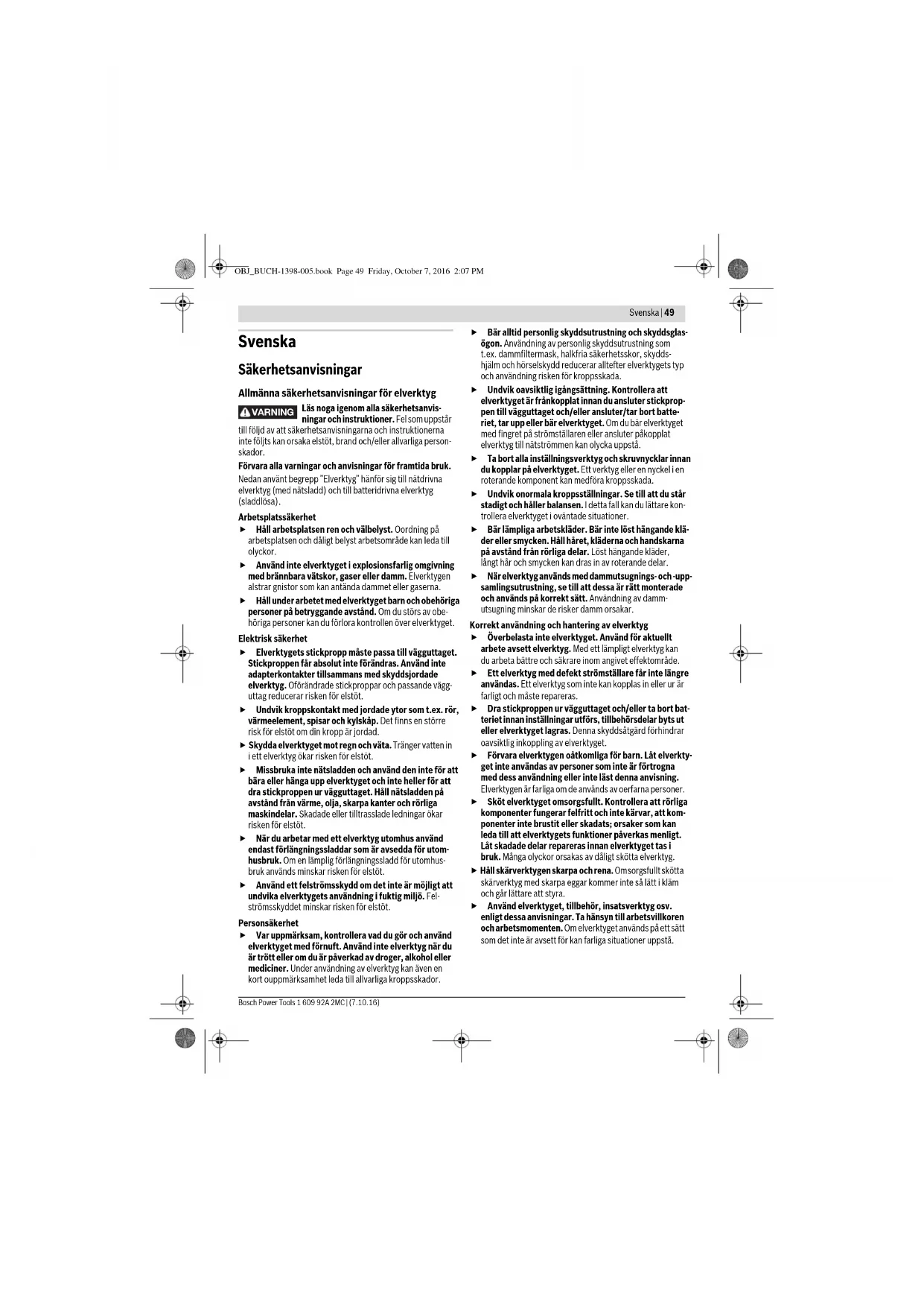 Kontrollera att bandsågbladet 6 sitter korrekt. Koppla upprepade gånger elverktyget från och åter till. Ett fel- monterat bandsågblad kan lossa och skada dig. Stödhandtag (se bild F) Använd alltid elverktyget med stödhandtag 9. Skruva in stödhandtaget i respektive gänghål 18 på huset. Damm-/spånutsugning Dammet från material som t.ex. blyhaltig målning, vissa träslag, mineraler och metall kan vara hälsovådligt. Berö- ring eller inandning av dammet kan orsaka allergiska reak- tioner och/eller andningsbesvär hos användaren eller per- soner som uppehåller sig i närheten. Vissa damm från ek eller bok anses vara cancerogena, spe- ciellt då i förbindelse med tillsatsämnen för träbehandling (kromat, träkonserveringsmedel). Endast yrkesmän får bearbeta asbesthaltigt material. – Se till att arbetsplatsen är väl ventilerad. – Vi rekommenderar ett andningsskydd i filterklass P2. Beakta de föreskrifter som i aktuellt land gäller för bearbe- tat material. Undvik dammanhopning på arbetsplatsen. Damm kan lätt självantändas. Drift Driftstart Insättning av batteri Använd endast original Bosch litiumjonbatterier med den spänning som anges på elverktygets typskylt. Används andra batterier finns risk för kroppsskada och brand. Skjut in uppladdat batteri 1 framifrån i elverktyget. Tryck full- ständigt in batteriet i elverktyget så att det låser i läge. In- och urkoppling För start av elverktyget tryck först på inkopplingsspärren 3 och därefter på strömställaren Till/Från 4 och håll den ned- tryckt. Lampan 2 lyser vid lätt eller helt nedtryckt strömställare Till/ Från 4 och belyser arbetsområdet vid ogynnsamma belys- ningsförhållanden. För frånkoppling av elverktyget släpp strömställaren Till/Från 4. Anvisning: Av säkerhetsskäl kan elverktygets strömställare Till/Från 4 inte låsas, utan måste under drift hållas nedtryckt. För att spara energi, koppla på elverktyget endast när du vill använda det. Djupurladdningsskydd Litium-jonbatteriet är med ”Electronic Cell Protection (ECP)” skyddad mot djupurladdning. Vid urladdat batteri kopplar skyddskopplingen från elverktyget: Insatsverktyget roterar inte längre. Temperaturberoende överbelastningsskydd Om elverktyget används på ändamålsenligt sätt kan det inte överbelastas. Vid för kraftig belastning eller om tillåten batte- ritemperatur på 70 °C överskrids, kopplar elektroniken bort elverktyget tills det åter uppnått optimal drifttemperatur. Arbetsanvisningar Håll i elverktyget med båda händerna under arbetet och se till att du står stadigt. Elverktyget kan styras säk- rare med två händer. Välj ett lämpligt snittläge för arbetsstycket att så att om möjligt många tänder på bandsågbladet 6 ligger i snittet (se bild G). Koppla på elverktyget, lägg upp det med styrhjälpen 5 på arbetsstycket och sänk långsamt ned bandsågbladet 6 i snittet. Såga med måttligt tryck och konstant matning. Minska trycket kort före snittets slut och håll elverktyget lätt uppåt så att det inte faller mot arbetsstycket. Underhåll och service Underhåll och rengöring Ta bort batteriet innan åtgärder utförs på elverktyget samt före transport och lagring. Om strömställaren Till/Från oavsiktligt påverkas finns risk för personskada. Lysdiod Kapacitet Permanent ljus 3 gröna ≥2/3 Permanent ljus 2 gröna ≥1/3 Permanent ljus 1 grönt <1/3 Blinkljus 1 grönt Reserv OBJ_BUCH-1398-005.book Page 52 Friday, October 7, 2016 2:07 PMNorsk | 53 Bosch Power Tools 1 609 92A 2MC | (7.10.16) Håll elverktyget och dess ventilationsöppningar rena för bra och säkert arbete. Kontakta en auktoriserad serviceverkstad för Bosch-elverk- tyg när batteriet inte längre är funktionsdugligt. Kundtjänst och användarrådgivning Kundservicen ger svar på frågor beträffande reparation och underhåll av produkter och reservdelar. Sprängskisser och information om reservdelar hittar du på: www.bosch-pt.com Bosch användarrådgivningsteamet hjälper gärna vid frågor som gäller våra produkter och tillbehör. Ange alltid vid förfrågningar och reservdelsbeställningar det 10-siffriga produktnumret som finns på elverktygets typskylt. Svenska Bosch Service Center Telegrafvej 3 2750 Ballerup Danmark Tel.: (020) 414455 (inom Sverige) Fax: (011) 187691 Transport De litiumjonbatterier som ingår är underkastade kraven för farligt gods. Användaren kan utan ytterligare förpliktelser transportera batterierna på allmän väg. Vid transport genom tredje person (t. ex. flygfrakt eller spedi- tion) ska speciella villkor för förpackning och märkning beak- tas. I detta fall bör vid förberedelse av transport en expert för farligt gods konsulteras. Batterier får försändas endast om höljet är oskadat. Tejpa öppna kontakter och förpacka batteriet så att det inte kan röras i förpackningen. Beakta även tillämpliga nationella föreskrifter. Avfallshantering Elverktyg, batterier, tillbehör och förpackning ska omhändertas på miljövänligt sätt för återvinning. Släng inte elverktyg och inte heller batterier i hushållsavfall! Endast för EU-länder: Enligt europeiska direktivet 2012/19/EU måste obrukbara elverktyg och enligt euro- peiska direktivet 2006/66/EG felaktiga eller förbrukade batterier separat omhän- dertas och på miljövänligt sätt lämnas in för återvinning. Sekundär-/primärbatterier: Li-jon: Beakta anvisningarna i avsnittet ”Transport”, sida 53. Ändringar förbehålles. Norsk Sikkerhetsinformasjon Generelle advarsler for elektroverktøy Les gjennom alle advarslene og anvis- ningene. Feil ved overholdelsen av ad- varslene og nedenstående anvisninger kan medføre elektris- ke støt, brann og/eller alvorlige skader. Ta godt vare på alle advarslene og informasjonene. Det nedenstående anvendte uttrykket «elektroverktøy» gjel- der for strømdrevne elektroverktøy (med ledning) og batteri- drevne elektroverktøy (uten ledning). Sik