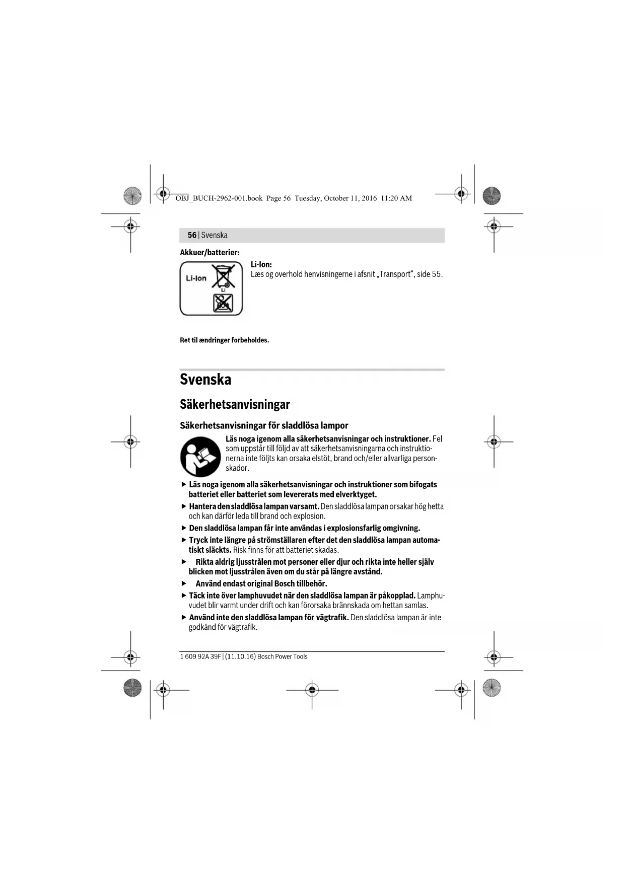- afhængigt af den anvendte akku ** begrænset effekt ved temperaturer <0 °C OBJ_BUCH-2962-001.book Page 53 Tuesday, October 11, 2016 11:20 AM54 | Dansk 1 609 92A 39F | (11.10.16) Bosch Power Tools Arbejdsvejledning Ophængningskrog (se Fig. A) Med ophængskroge 3 kan den batteridrevne lampe fastgøres på en genstand. Indstilling af akku-lampe (se Fig. B) Du kan anvende akku-lampen opretstående, hængende eller liggende. Den 6-kantede form sikrer, at lyset indstilles efter anvendelsen. Vedligeholdelse og service Vedligeholdelse og rengøring Når akkuen ikke fungerer mere, bedes du kontakte et autoriseret serviceværksted for Bosch el-værktøj. Akku-lampen er vedligeholdelsesfri og består ikke af dele, der skal skiftes eller vedli- geholdes. Lyskilden kan ikke udskiftes. Hvis lyskilden er defekt, skal hele akku-lampen udskif- tes. Rengør kun kunststofskiven på akku-lampen med en tør, blød klud for at undgå beska- digelser. Anvend ikke rengørings- eller opløsningsmidler. Kundeservice og brugerrådgivning Kundeservice besvarer dine spørgsmål vedr. reparation og vedligeholdelse af dit pro- dukt samt reservedele. Eksplosionstegninger og informationer om reservedele findes også under: www.bosch-pt.com Bosch brugerrådgivningsteamet vil gerne hjælpe dig med at besvare spørgsmål vedr. vores produkter og deres tilbehør. Produktets 10-cifrede typenummer (se typeskilt) skal altid angives ved forespørgsler og bestilling af reservedele. OBJ_BUCH-2962-001.book Page 54 Tuesday, October 11, 2016 11:20 AMDansk | 55 Bosch Power Tools 1 609 92A 39F | (11.10.16) Dansk Bosch Service Center Telegrafvej 3 2750 Ballerup På www.bosch-pt.dk kan der online bestilles reservedele eller oprettes en reparati- ons ordre. Tlf. Service Center: 44898855 Fax: 44898755 E-Mail: vaerktoej@dk.bosch.com Transport De indeholdte Li-Ion-akkuer overholder bestemmelserne om farligt gods. Akkuerne kan transporteres af brugeren på offentlig vej uden yderligere pålæg. Ved forsendelse gennem tredjemand (f.eks.: lufttransport eller spedition) skal særli- ge krav vedr. emballage og mærkning overholdes. Her skal man kontakte en faregods- ekspert, før forsendelsesstykket forberedes. Send kun akkuer, hvis huset er ubeskadiget. Tilklæb åbne kontakter og indpak akkuen på en sådan måde, at den ikke kan bevæge sig i emballagen. Følg venligst også eventuelle, videreførende, nationale forskrifter. Bortskaffelse Akku-lamper, akkuer, tilbehør og emballage skal genbruges på en miljøvenlig måde. Smid ikke akku-lamper og akkuer/batterier ud sammen med det almindelige hushold- ningsaffald! Gælder kun i EU-lande: Iht. det europæiske direktiv 2012/19/EU om affald af elektrisk og elektronisk udstyr skal ikke mere brugbare akku-lamper og iht. di- rektiv 2006/66/EF skal defekte eller udtjente akkuer/batterier samles separat og genbruges iht. gældende miljøforskrifter. OBJ_BUCH-2962-001.book Page 55 Tuesday, October 11, 2016 11:20 AM56 | Svenska 1 609 92A 39F | (11.10.16) Bosch Power Tools Akkuer/batterier: Li-Ion: Læs og overhold henvisningerne i afsnit „Transport“, side 55. Ret til ændringer forbeholdes. Svenska Säkerhetsanvisningar Säkerhetsanvisningar för sladdlösa lampor Läs noga igenom alla säkerhetsanvisningar och instruktioner. Fel som uppstår till följd av att säkerhetsanvisningarna och instruktio- nerna inte följts kan orsaka elstöt, brand och/eller allvarliga person- skador. Läs noga igenom alla säkerhetsanvisningar och instruktioner som bifogats batteriet eller batteriet som levererats med elverktyget. Hantera den sladdlösa lampan varsamt. Den sladdlösa lampan orsakar hög hetta och kan därför leda till brand och explosion. Den sladdlösa lampan får inte användas i explosionsfarlig omgivning. Tryck inte längre på strömställaren efter det den sladdlösa lampan automa- tiskt släckts. Risk finns för att batteriet skadas. Rikta aldrig ljusstrålen mot personer eller djur och rikta inte heller själv blicken mot ljusstrålen även om du står på längre avstånd. Använd endast original Bosch tillbehör. Täck inte över lamphuvudet när den sladdlösa lampan är påkopplad. Lamphu- vudet blir varmt under drift och kan förorsaka brännskada om hettan samlas. Använd inte den sladdlösa lampan för vägtrafik. Den sladdlösa lampan är inte godkänd för vägtrafik. OBJ_BUCH-2962-001.book Page 56 Tuesday, October 11, 2016 11:20 AMSvenska | 57 Bosch Power Tools 1 609 92A 39F | (11.10.16) Ta bort batterierna ur den sladdlösa lampan vid alla åtgärder på lampan (t. ex. montering, service etc.) samt vid transport och lagring. Låt inte barn använda den sladdlös lampan. Den är avsedd för yrkesmässig användning. Risk finns att barn bländar sig själv eller andra personer. Öppna inte batteriet. Detta kan leda till kortslutning. Skydda batteriet mot hög värme som t. ex. längre solbestrålning, eld, vatten och fukt. Explosionsrisk föreligger. Håll gem, mynt, nycklar, spikar, skruvar och andra små metallföremål på avstånd från reservbatterier för att undvika en bygling av kontakterna. En kortslutning av batteriets kontakter kan leda till brännskador eller brand. Om batteriet används på fel sätt finns risk för att vätska rinner ur batteriet. Undvik kontakt med vätskan. Vid oavsiktlig kontakt spola med vatten. Om vätska kommer i kontakt med ögonen uppsök dessutom läkare. Batterivätskan kan medföra hudirritation och brännskada. I skadat eller felanvänt batteri kan ångor uppstå. Tillför friskluft och uppsök läkare vid åkommor. Ångorna kan leda till irritation i andningsvägarna. Ladda batterierna endast i de laddare som tillverkaren rekommenderat. Om en laddare som är avsedd för en viss typ av batterier används för andra batterity- per finns risk för brand. Använd batteriet endast för produkter från Bosch. På så sätt skyddas batteriet mot farlig överbelastning. Batteriet kan skadas av vassa föremål som t. ex. spikar eller skruvmejs