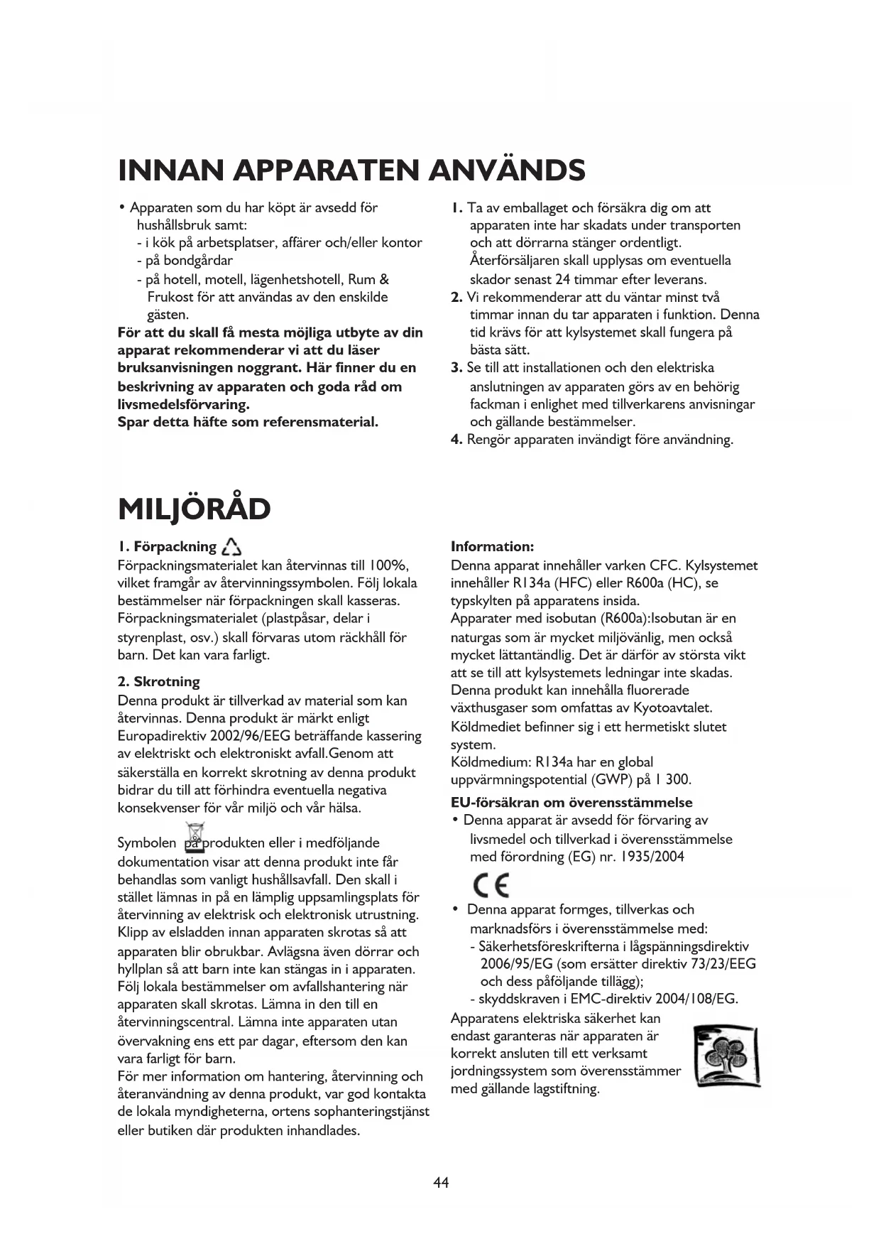 Denna produkt är tillverkad av material som kan återvinnas. Denna produkt är märkt enligt Europadirektiv 2002/96/EEG beträffande kassering av elektriskt och elektroniskt avfall.Genom att säkerställa en korrekt skrotning av denna produkt bidrar du till att förhindra eventuella negativa konsekvenser för vår miljö och vår hälsa. Symbolen på produkten eller i medföljande dokumentation visar att denna produkt inte får behandlas som vanligt hushållsavfall. Den skall i stället lämnas in på en lämplig uppsamlingsplats för återvinning av elektrisk och elektronisk utrustning. Klipp av elsladden innan apparaten skrotas så att apparaten blir obrukbar. Avlägsna även dörrar och hyllplan så att barn inte kan stängas in i apparaten. Följ lokala bestämmelser om avfallshantering när apparaten skall skrotas. Lämna in den till en återvinningscentral. Lämna inte apparaten utan övervakning ens ett par dagar, eftersom den kan vara farligt för barn. För mer information om hantering, återvinning och återanvändning av denna produkt, var god kontakta de lokala myndigheterna, ortens sophanteringstjänst eller butiken där produkten inhandlades. Information: Denna apparat innehåller varken CFC. Kylsystemet innehåller R134a (HFC) eller R600a (HC), se typskylten på apparatens insida. Apparater med isobutan (R600a):Isobutan är en naturgas som är mycket miljövänlig, men också mycket lättantändlig. Det är därför av största vikt att se till att kylsystemets ledningar inte skadas. Denna produkt kan innehålla fluorerade växthusgaser som omfattas av Kyotoavtalet. Köldmediet befinner sig i ett hermetiskt slutet system. Köldmedium: R134a har en global uppvärmningspotential (GWP) på 1 300. EU-försäkran om överensstämmelse