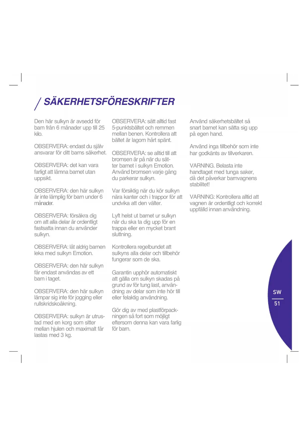 Den här sulkyn är avsedd för barn från 6 månader upp till 25 kilo. OBSERVERA: endast du själv ansvarar för ditt barns säkerhet. OBSERVERA: det kan vara farligt att lämna barnet utan uppsikt. OBSERVERA: den här sulkyn är inte lämplig för barn under 6 månader. OBSERVERA: försäkra dig om att alla delar är ordentligt fastsatta innan du använder sulkyn. OBSERVERA: låt aldrig barnen leka med sulkyn Emotion. OBSERVERA: den här sulkyn får endast användas av ett barn i taget. OBSERVERA: den här sulkyn lämpar sig inte för jogging eller rullskridskoåkning. OBSERVERA: sulkyn är utrus- tad med en korg som sitter mellan hjulen och maximalt får lastas med 3 kg. OBSERVERA: sätt alltid fast 5-punktsbältet och remmen mellan benen. Kontrollera att bältet är lagom hårt spänt. OBSERVERA: se alltid till att bromsen är på när du sät- ter barnet i sulkyn Emotion. Använd bromsen varje gång du parkerar sulkyn. Var försiktig när du kör sulkyn nära kanter och i trappor för att undvika att den välter. Lyft helst ut barnet ur sulkyn när du ska ta dig upp för en trappa eller en mycket brant sluttning. Kontrollera regelbundet att sulkyns alla delar och tillbehör fungerar som de ska. Garantin upphör automatiskt att gälla om sulkyn skadas på grund av för tung last, använ- dning av delar som inte hör till eller felaktig användning. Gör dig av med plastförpack- ningen så fort som möjligt eftersom denna kan vara farlig för barn. Använd säkerhetsbältet så snart barnet kan sätta sig upp på egen hand. Använd inga tillbehör som inte har godkänts av tillverkaren. VARNING. Belasta inte handtaget med tunga saker, då det påverkar barnvagnens stabilitet! VARNING: Kontrollera alltid att vagnen är ordentligt och korrekt uppfälld innan användning.