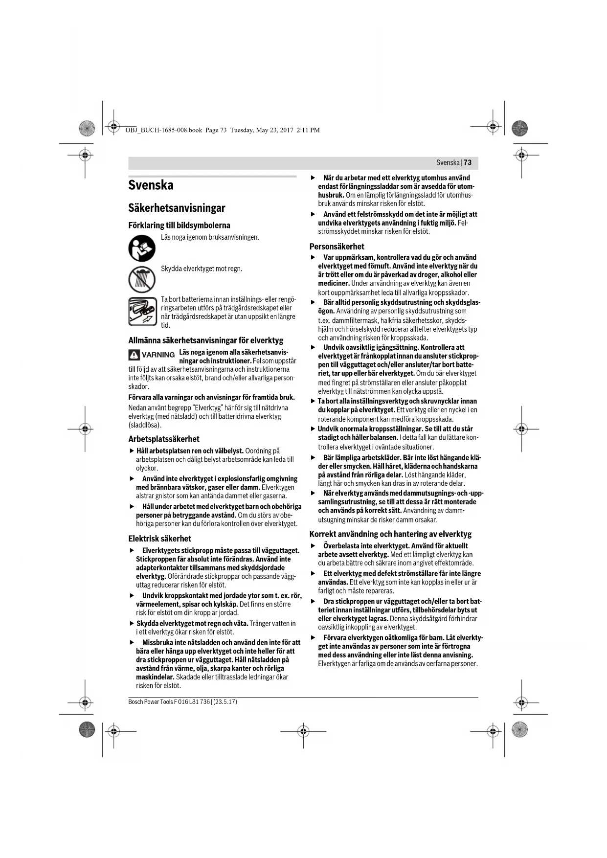 OBJ_BUCH-1685-008.book Page 76 Tuesday, May 23, 2017 2:11 PMSvenska | 77 Bosch Power Tools F 016 L81 736 | (23.5.17) Buller-/vibrationsdata Bullernivåvärde förmedlas enligt EN 60745-2-15. Redskapets A-vägda ljudnivå uppnår i typiska fall: Ljudtryck- snivå 67 dB(A); ljudeffektnivå 87 dB(A). Onoggrannhet K=3dB. Använd hörselskydd! Totala vibrationsemissionsvärden a