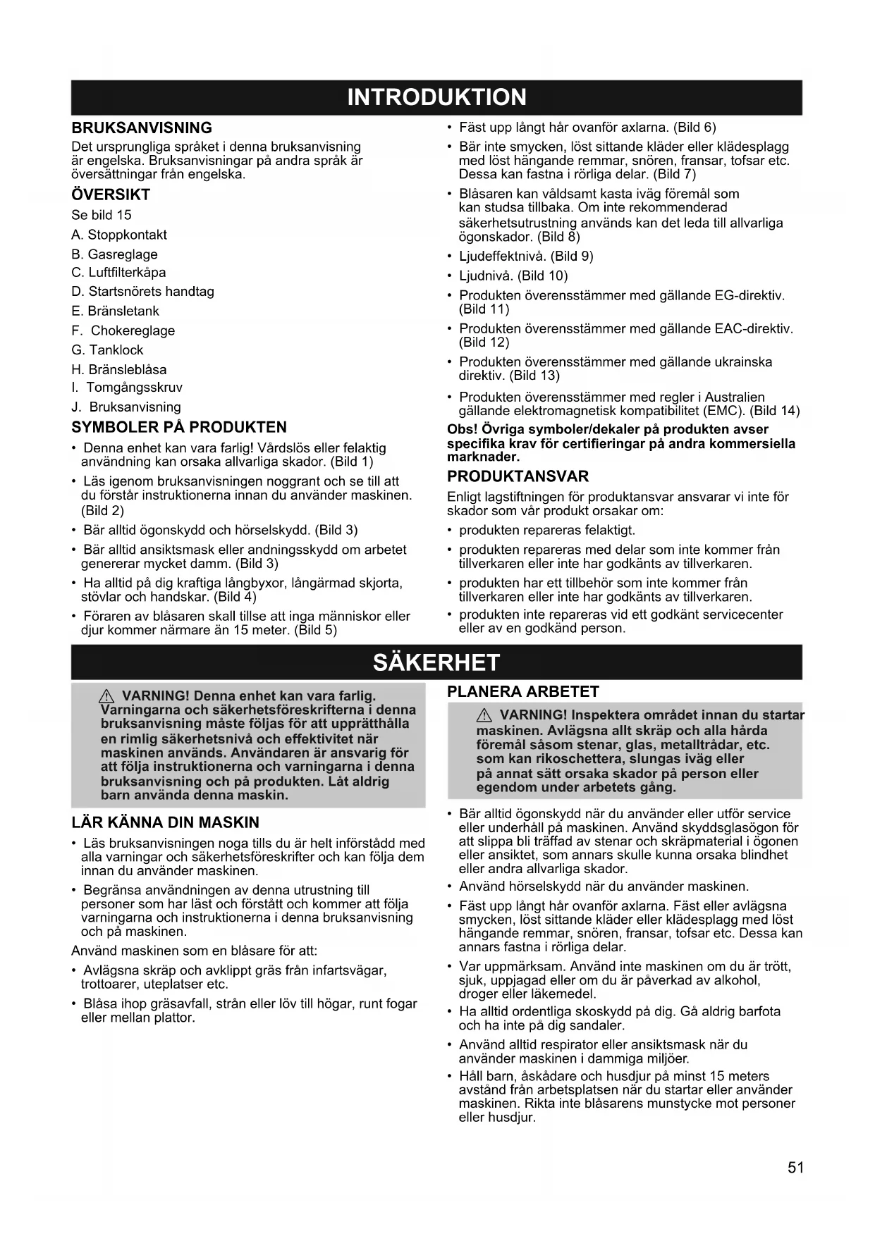 - Häll barn, askádare och husdjur på minst 15 meters avstand frán arbetsplatsen nár du startar eller använder maskinen. Rikta inte blásarens munstycke mot personer eller husdjur.