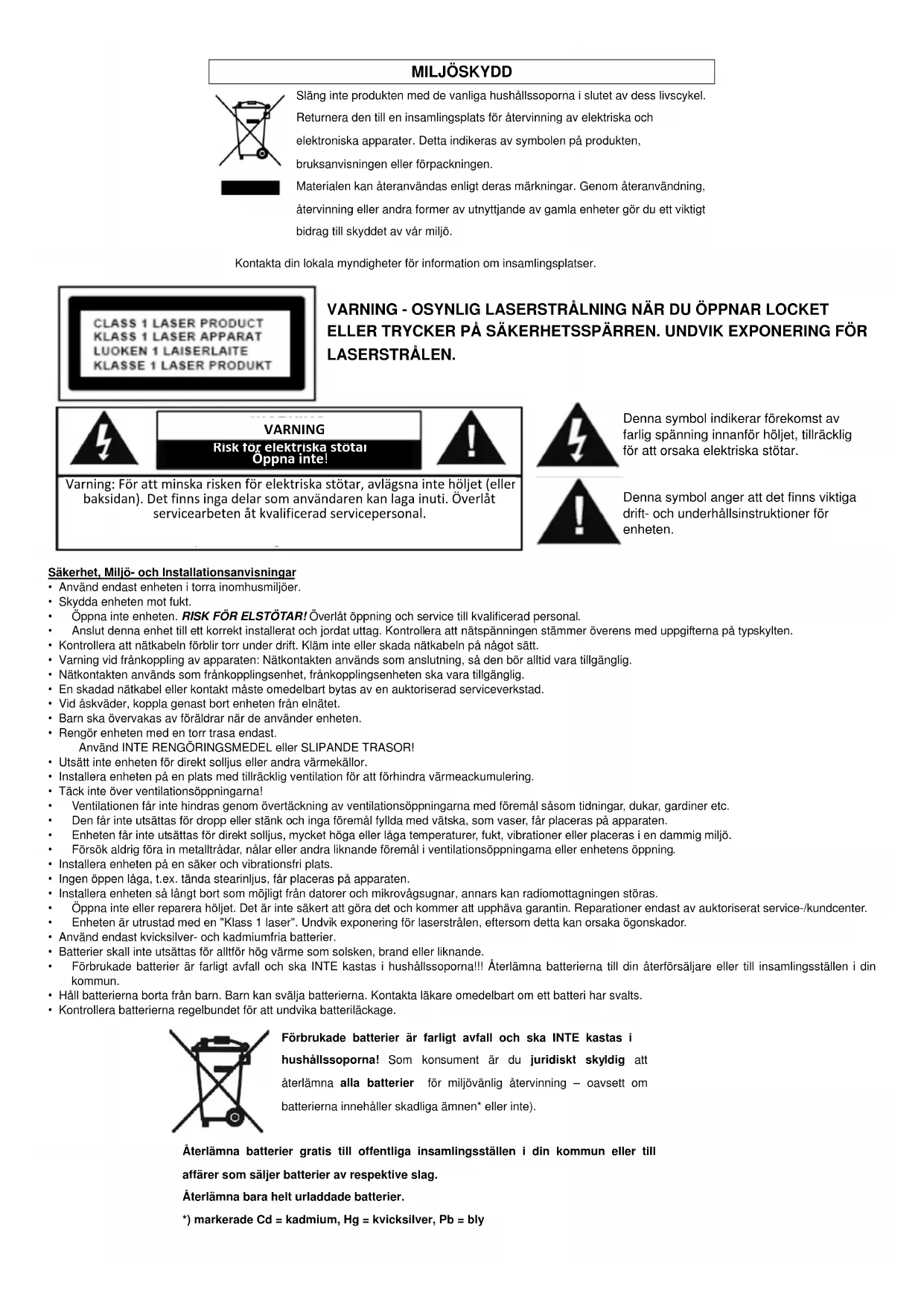 Förbrukade batterier ar farligt avfall och ska INTE kastas i hushállssoporna! Som konsument ar du juridiskt skyldig att áterlámna alla batterier För miljövänlig átervinning - oavsett om batterierna innehäller skadliga ämn* eller inte).