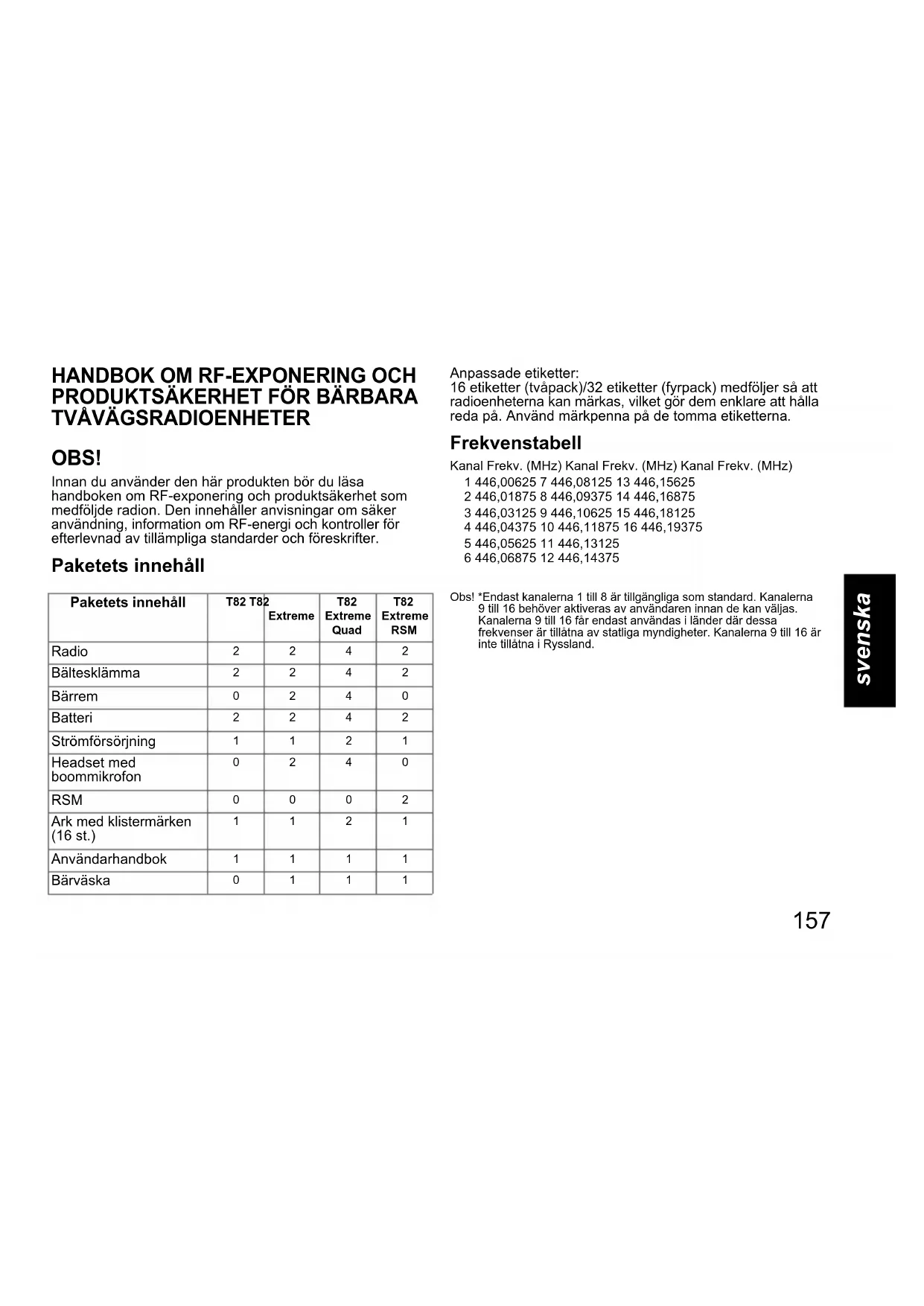 OBS! Innan du använder den här produkten bör du läsa handboken om RF-exponering och produktsäkerhet som medföljde radion. Den innehåller anvisningar om säker användning, information om RF-energi och kontroller för efterlevnad av tillämpliga standarder och föreskrifter. Paketets innehåll Anpassade etiketter: 16 etiketter (tvåpack)/32 etiketter (fyrpack) medföljer så att radioenheterna kan märkas, vilket gör dem enklare att hålla reda på. Använd märkpenna på de tomma etiketterna. Frekvenstabell Obs! *Endast kanalerna 1 till 8 är tillgängliga som standard. Kanalerna 9 till 16 behöver aktiveras av användaren innan de kan väljas. Kanalerna 9 till 16 får endast användas i länder där dessa frekvenser är tillåtna av statliga myndigheter. Kanalerna 9 till 16 är inte tillåtna i Ryssland. Paketets innehåll T82 T82 Extreme T82 Extreme Quad T82 Extreme RSM Radio