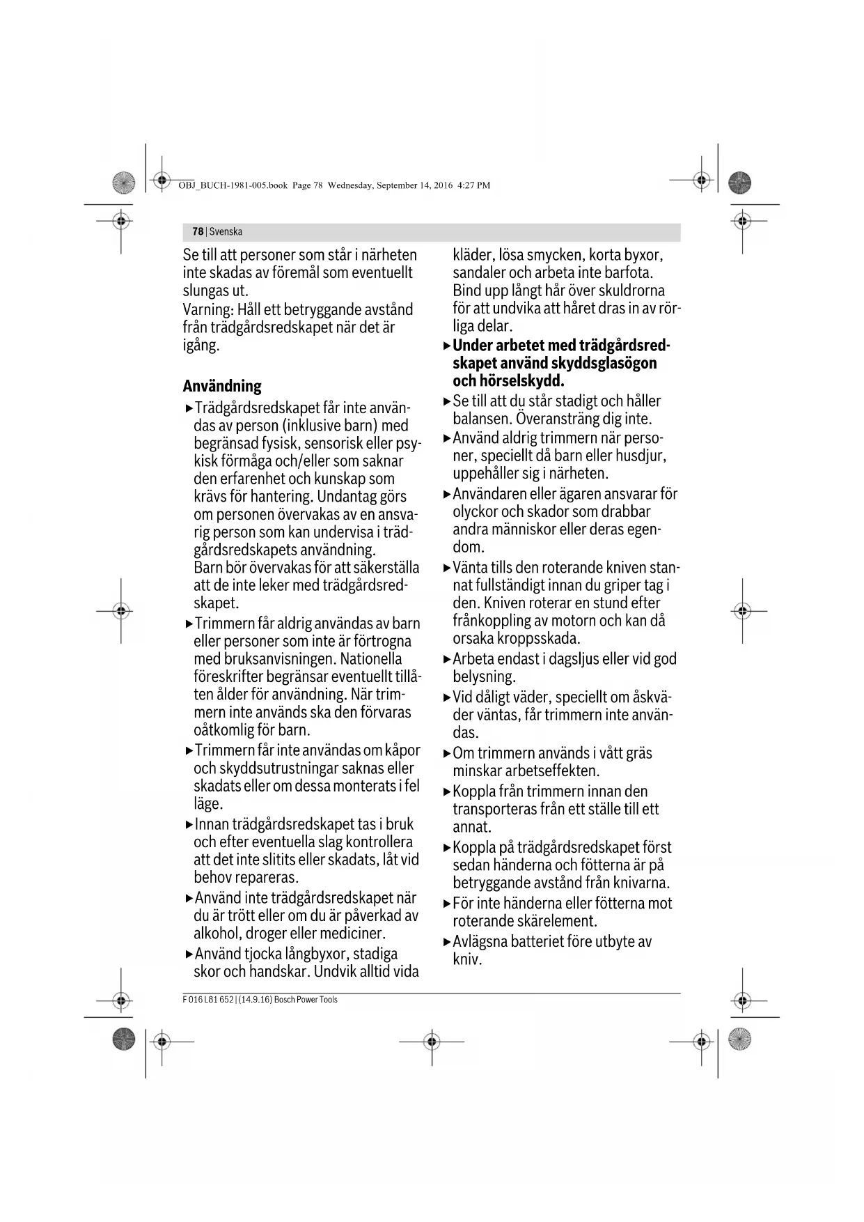 PAS PÅ OBJ_BUCH-1981-005.book Page 75 Wednesday, September 14, 2016 4:27 PM76 | Dansk F 016 L81 652 | (14.9.16) Bosch Power Tools Betydning af de forskellige displayelementer Den grønne batteri-ladevisning blinker (hurtigt) Hurtigopladningen angives ved at den grønne batteri-ladetilstandsvisning blinker hurtigt. Bemærk: Hurtigopladningen er kun mulig, hvis akkumulato- rens temperatur er i det tilladte ladetemperaturområde, se af- snit „Tekniske data“. Den grønne batteri-ladevisning blinker (lang- somt) Hvis batteriet er ladet 80 % op, blinker den grønne batteri-ladevisning langsomt. Batteriet kan tages ud og bruges med det samme. Konstant grøn akku-kontrollampe Når den grønne akku-kontrollampe lyser kon- stant, er akkuen helt opladet. Er akkuen ikke sat i, betyder et konstant lys i akku-kontrol- lampen, at netstikket er sat i stikdåsen og ladeaggregatet er klart. Konstant lys rød akku-kontrollampe Når den røde akku-kontrollampe lyser kon- stant, er akkuens temperatur uden for det tillad- te ladetemperaturområde, se afsnit „Tekniske data“. Så snart det tilladte temperaturområde er nået, kobler ladeaggregatet automatisk om til hurtigopladning. Blinklys rød akku-kontrollampe Blinklyset fra den røde akku-ladeindikator sig- naliserer en anden fejl på opladningen, se afsnit „Fejlsøgning“. Tips vedr. opladning Opladningsaggregatet kan blive varmt, hvis det oplades hele tiden eller en opladningscyklus følger den næste uden afbry- delser. Dette er dog uden betydning og er ikke tegn på en tek- nisk defekt af ladeaggregatet. Når driftstiden pr. opladning forkortes væsentligt, er det tegn på, at akkuerne er slidt op og skal udskiftes. Fejlsøgning d.c. Symptom Mulig årsag Afhjælpning Beskyttelsesskærmen kan ikke trækkes hen over skæreskiven Forkert montering Fjern skæreskiven og monter beskyttel- sesskærmen igen Græstrimmeren arbejder ikke Akkuen er afladt Oplad akkuen, se også „Forskrifter mht. opladning“ Akkuen er for kold/varm Opvarm/afkøl akkuen Græstrimmeren arbejder med afbrydel- ser Haveværktøjets indvendige ledninger er beskadiget Kontakt serviceforhandleren Start-stop-kontakten er defekt Kontakt serviceforhandleren Haveværktøj er overbelastet Græsset er for højt Klip græsset i flere omgange Haveværktøj skærer ikke Knivene er beskadigede Kniv skiftes Forstærkede vibrationer Knivene er beskadigede Kniv skiftes Akku-kontrollampe lyser hele tiden Opladning er ikke mulig Akku er ikke sat (rigtigt) i Sæt akku korrekt på ladeaggregat Akkukontakter er snavset Rengør akkukontakter; f.eks. ved at sæt- te akkuen i og tage den ud flere gange el- ler erstatte den Akku defekt Skift akkuen Akku-ladeindikator lyser ikke Ladeaggregatets netstik er ikke sat (rig- tigt) i Sæt netstikket (helt) ind i stikdåsen Stikdåse, netkabel eller ladeaggregat er defekt Kontrollér netspændingen, lad evt. lade- aggregatet blive kontrolleret af en auto- riseret servicecenter for Bosch-el-værk- tøj OBJ_BUCH-1981-005.book Page 76 Wednesday, September 14, 2016 4:27 PMSvenska | 77 Bosch Power Tools F 016 L81 652 | (14.9.16) Kundeservice og brugerrådgivning www.bosch-garden.com Det 10-cifrede typenummer på haveværktøjets typeskilt skal altid angives ved forespørgsler og bestilling af reservedele. Dansk Bosch Service Center Telegrafvej 3 2750 Ballerup På www.bosch-pt.dk kan der online bestilles reservedele eller oprettes en reparations ordre. Tlf. Service Center: 44898855 Fax: 44898755 E-Mail: vaerktoej@dk.bosch.com Transport De indeholdte Li-Ion-akkuer overholder bestemmelserne om farligt gods. Akkuerne kan transporteres af brugeren på of- fentlig vej uden yderligere pålæg. Ved forsendelse gennem tredjemand (f.eks.: lufttransport el- ler spedition) skal særlige krav vedr. emballage og mærkning overholdes. Her skal man kontakte en faregodsekspert, før forsendelsesstykket forberedes. Send kun akkuer, hvis huset er ubeskadiget. Tilklæb åbne kontakter og indpak akkuen på en sådan måde, at den ikke kan bevæge sig i emballagen. Følg venligst også eventuelle, videreførende, nationale for- skrifter. Bortskaffelse Smid ikke haveværktøj, ladeaggregater og akkuer/batterier ud sammen med det almindelige husholdningsaffald! Gælder kun i EU-lande: Iht. det europæiske direktiv 2012/19/EU skal affald af elektrisk og elektronisk udstyr (WEEE) og iht. det europæiske direktiv 2006/66/EF skal defekte eller opbrugte ak- kuer/batterier indsamles separat og genbru- ges iht. gældende miljøforskrifter. Akkuer/batterier: Li-Ion: Følg venligst henvisninger i afsnit „Trans- port“. Ret til ændringer forbeholdes. Svenska Säkerhetsanvisningar Obs! Läs noggrant igenom anvisning- arna. Gör dig förtrogen med träd- gårdsredskapets manöverorgan och dess korrekta användning. Förvara bruksanvisningen för senare behov. Förklaring till bildsymbolerna Allmän varning för riskmoment. Läs noga igenom bruksanvis- ningen. Se till att personer som står i närheten inte skadas av föremål som eventuellt slungas ut. Varning: Håll ett betryggande avstånd från trädgårdsredska- pet när det är igång. Gäller inte. Ta bort batterierna innan inställnings- eller rengöringsar- beten utförs på trädgårdsred- skapet eller när trädgårdsredskapet är utan uppsikt en längre tid. Bär hörselskydd och skydds- glasögon. Använd inte trimmern vid regn och låt den inte heller stå ute i regn. a.c. d.c. OBJ_BUCH-1981-005.book Page 77 Wednesday, September 14, 2016 4:27 PM78 | Svenska F 016 L81 652 | (14.9.16) Bosch Power Tools Se till att personer som står i närheten inte skadas av föremål som eventuellt slungas ut. Varning: Håll ett betryggande avstånd från trädgårdsredskapet när det är igång. Användning Trädgårdsredskapet får inte använ- das av person (inklusive barn) med begränsad fysisk, sensorisk eller psy- kisk förmåga och/eller som saknar den erfarenhet och kunskap som krävs för hantering. Undantag görs om personen övervak