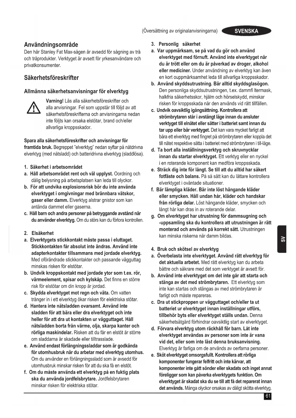 Allmanna sakerhetsanvisningar for elverktyg