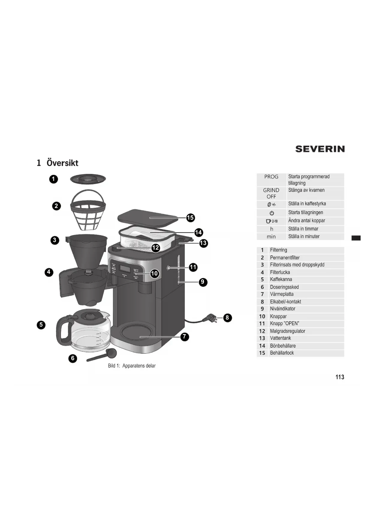 - Ställa in timmar min Ställa in minuter114 SV SV Bästa/bäste kund, vi tackar för ditt förtroende och önskar dig mycket glädje med din kvalitets- produkt från SEVERIN. Märket SEVERIN står sedan över 120 år för beständighet, tysk kvalitet och utvecklingskraft. Varje apparat har tillverkats och provats med omsorg. Familjeföretaget från Sundern i Tyskland har alltid stått för grundlighet, noggrannhet och ärlighet och övertygar kunder över hela världen med innovativa produkter ända sedan grundandet 1892. I de åtta produktgrupperna Kaffe, Frukost, Köket, Grillning, Hushåll, Golvvård, Hälsa och skönhet och Kyl och frys erbjuder SEVERIN ett omfattande sortiment av elektriska småapparater som omfattar mer än 250 produkter. Den rätta produkten för varje tillfälle! Lär känna SEVERINS mångfald av produkter och besök oss på www.severin.de eller www.severin.com. Ditt SEVERIN-team Innehållsförteckning 1 Översikt p. 113