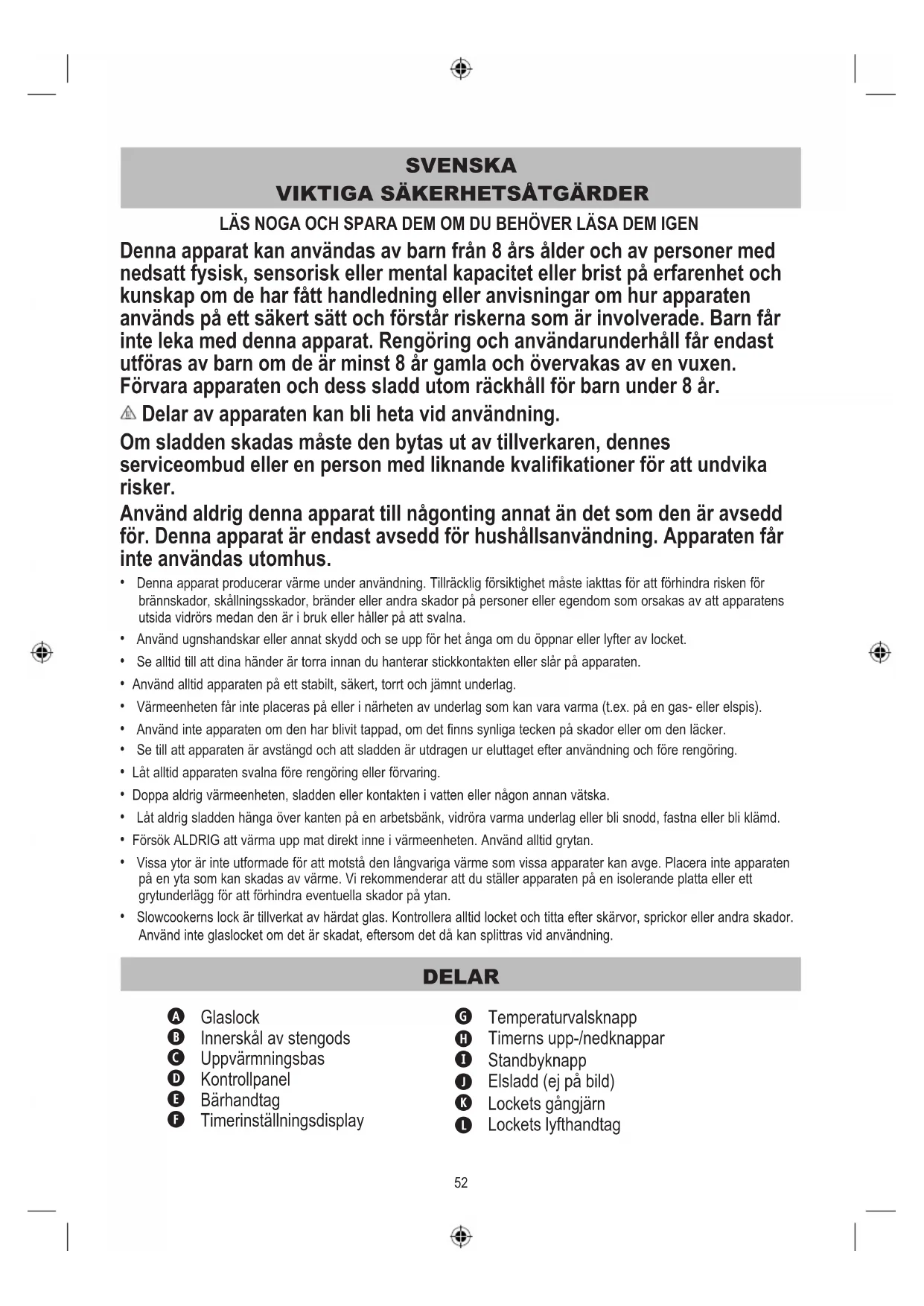 LÄS NOGA OCH SPARA DEM OM DU BEHÖVER LÄSA DEM IGEN Denna apparat kan användas av barn från 8 års ålder och av personer med nedsatt fysisk, sensorisk eller mental kapacitet eller brist på erfarenhet och kunskap om de har fått handledning eller anvisningar om hur apparaten används på ett säkert sätt och förstår riskerna som är involverade. Barn får inte leka med denna apparat. Rengöring och användarunderhåll får endast utföras av barn om de är minst 8 år gamla och övervakas av en vuxen. Förvara apparaten och dess sladd utom räckhåll för barn under 8 år. Delar av apparaten kan bli heta vid användning. Om sladden skadas måste den bytas ut av tillverkaren, dennes serviceombud eller en person med liknande kvalifikationer för att undvika risker. Använd aldrig denna apparat till någonting annat än det som den är avsedd för. Denna apparat är endast avsedd för hushållsanvändning. Apparaten får inte användas utomhus.