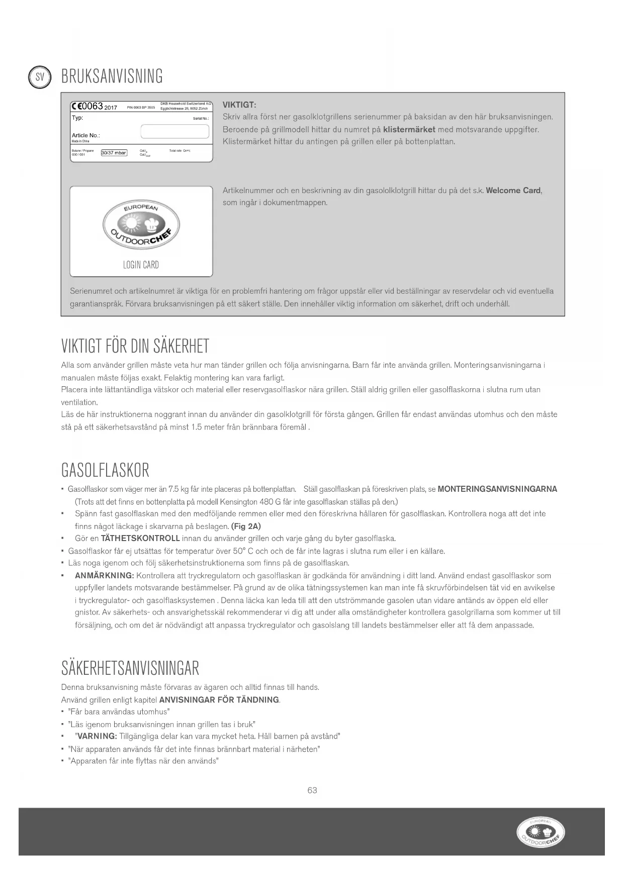 BRUKSANVISNING 63 Läs de här enkla instruktionerna innan du börjar använda den OUTDOORCHEF här grillen –annars kanske du aldrig kommer underfund med hur duktig du är på att grilla.