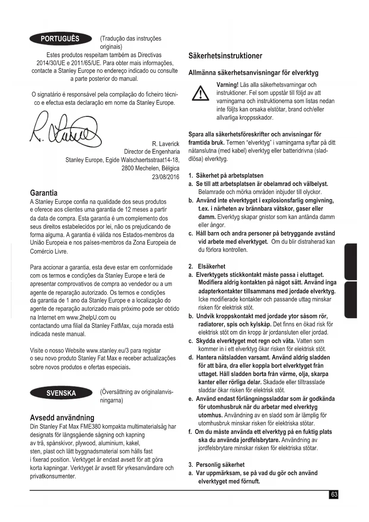 De har produiterna overensstämmer även med direktiven 2014/30/EU och 2011/65/EU. Mer information fár du genom att kontakta Stanley Europe på följande adress aller titta i slutet av bruksanvisingen.